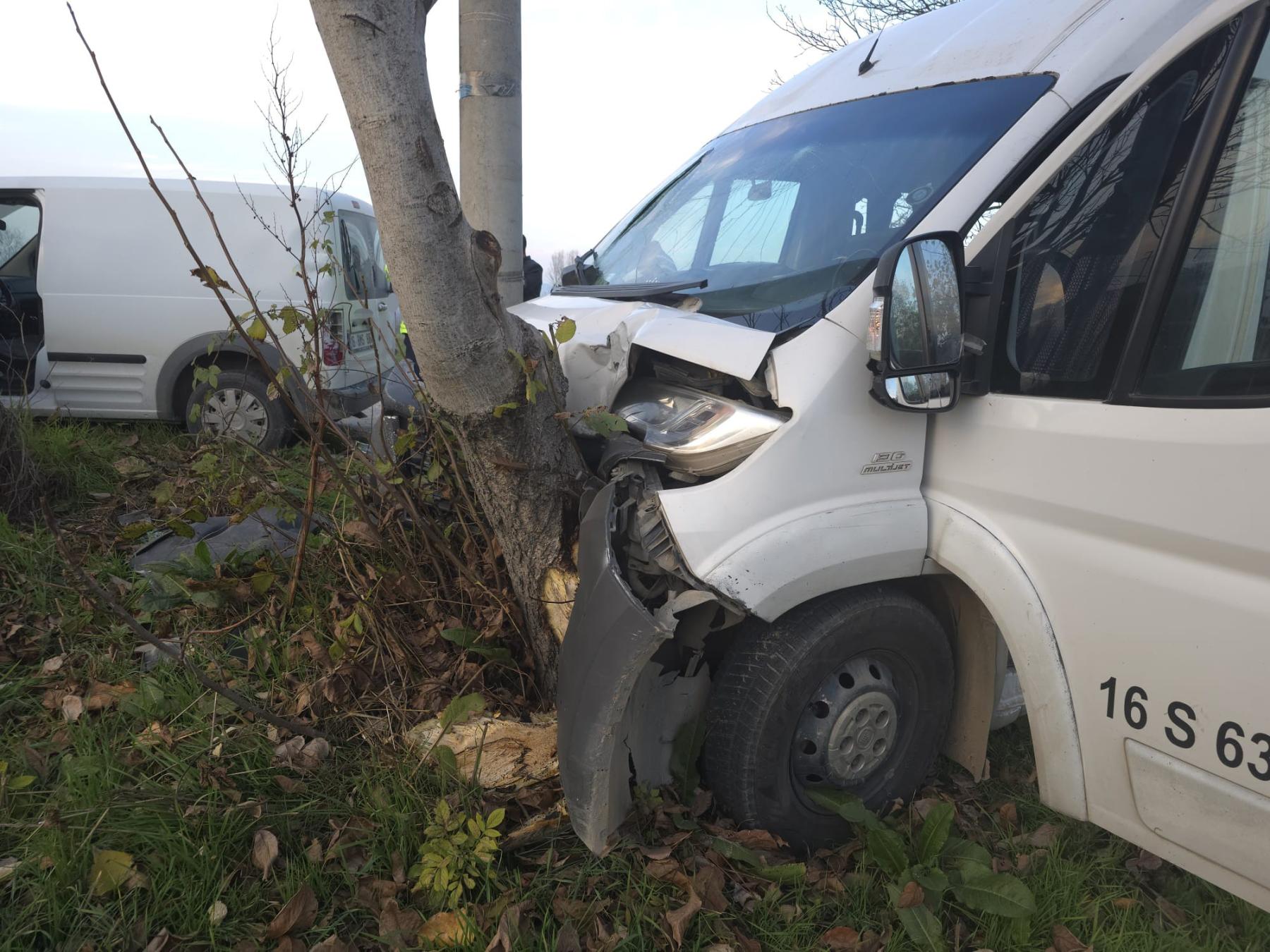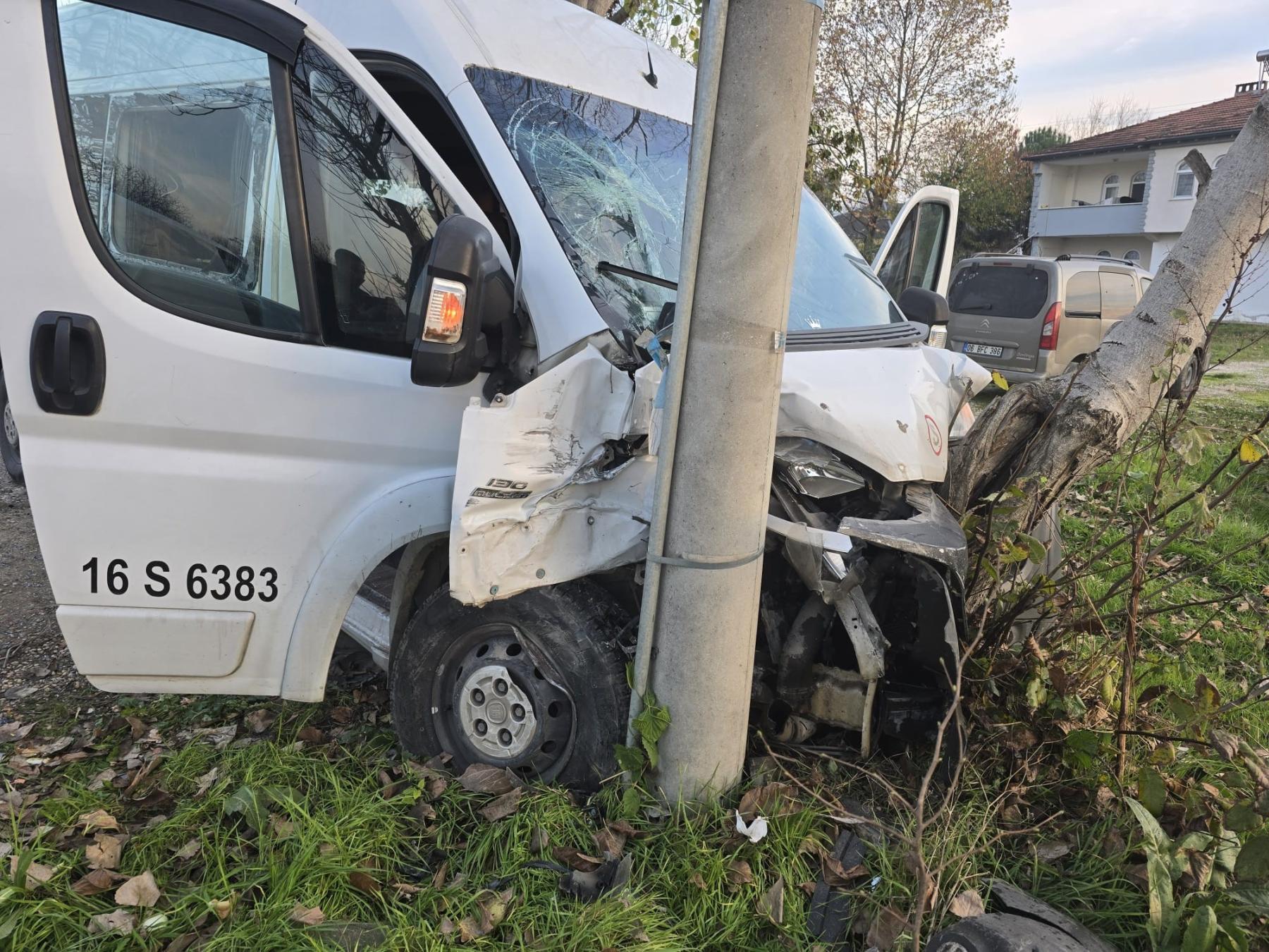 Kazada minibüs ile hafif ticari araç yol kenarındaki ağaç ile enerji nakil hattı beton direğine çarptı.
