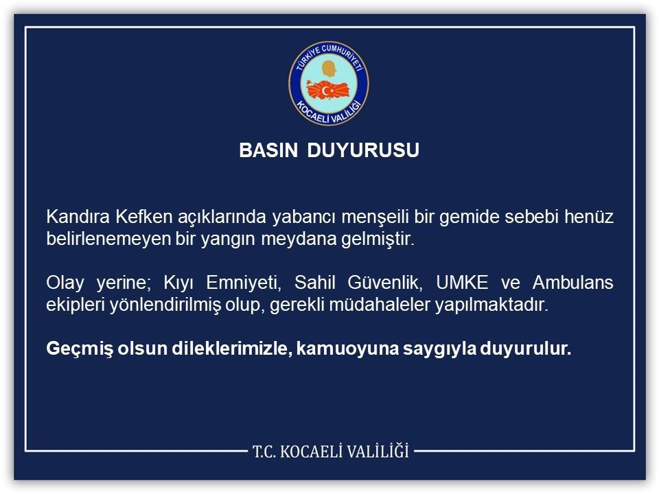 Açıklamada, "Kandıra Kefken açıklarında yabancı menşeli bir gemide sebebi henüz belirlenemeyen bir yangın meydana gelmiştir. Olay yerine; Kıyı Emniyeti, Sahil Güvenlik, UMKE ve ambulans ekipleri yönlendirilmiş olup, gerekli müdahaleler yapılmaktadır. Geçmiş olsun dileklerimizle, kamuoyuna saygıyla duyurulur" ifadeleri yer aldı.
