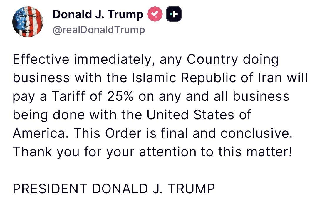 ABD Başkanı Donald Trump, İran ile iş yapan ülkelerin ABD ile gerçekleştirdiği her türlü ticari faaliyette yüzde 25 gümrük vergisi ödeyeceğini açıkladı.