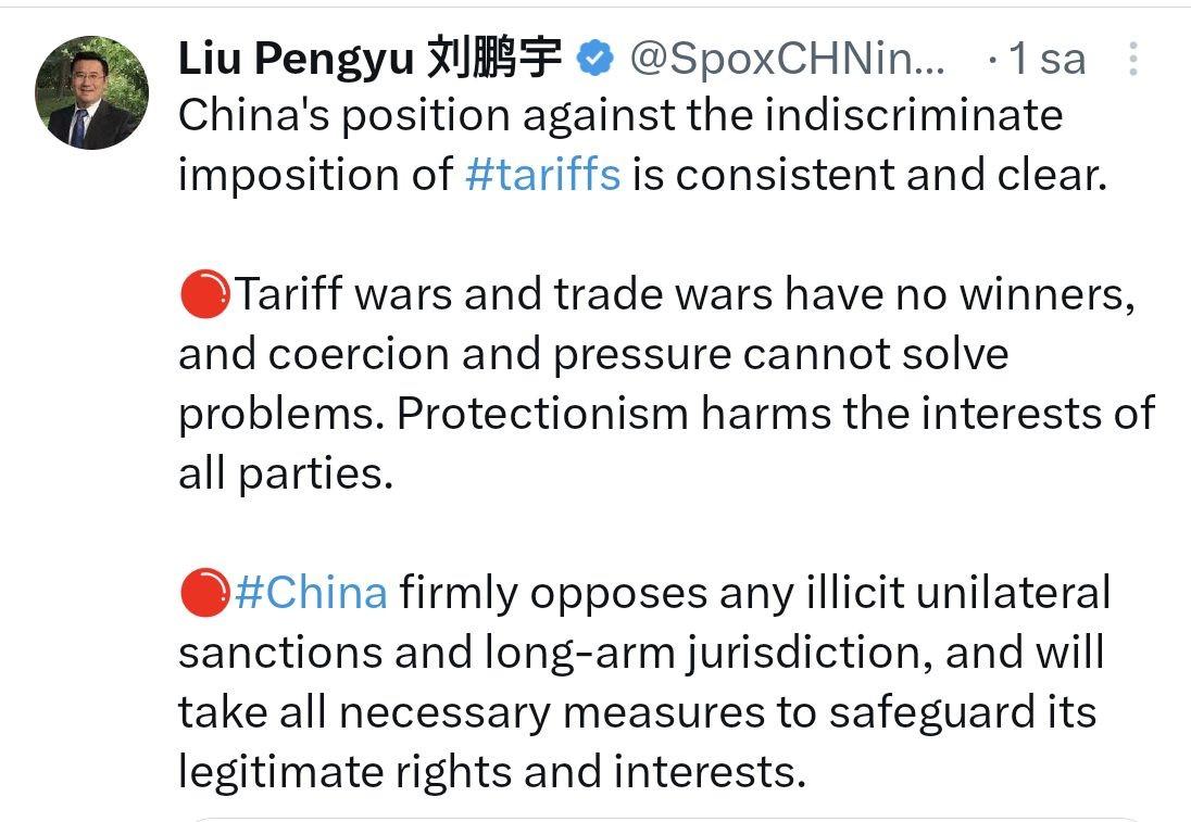Çin’in ABD Büyükelçiliği’nden yapılan açıklamada, ABD Başkanı Donald Trump’ın İran ile iş yapan ülkelere yüzde 25 gümrük vergisi uygulama kararına tepki gösterilerek, "Çin, çıkarlarını korumak için gerekli tüm önlemleri alacaktır" uyarısında bulunuldu.