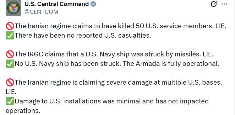 ABD ordusu, İran karşısında önemli kayıplar verildiği yönündeki iddiaları yalanlayarak, "ABD tesislerindeki hasar minimaldir ve operasyonları etkilememiştir" açıklamasında bulundu.