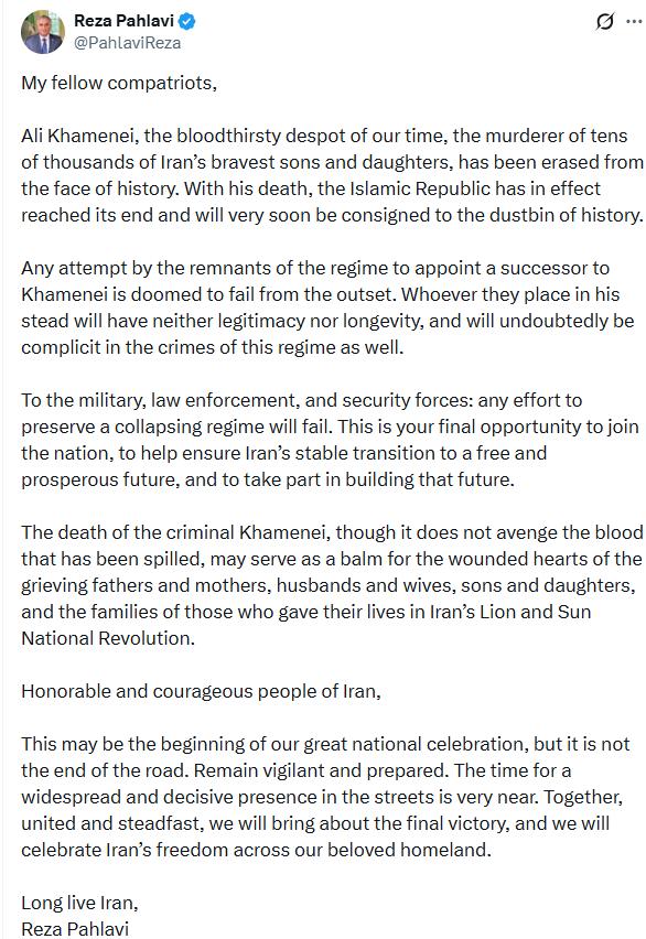 Devrik İran Şahı Muhammed Rıza Pehlevi’nin sürgündeki oğlu Rıza Pehlevi, İran’ın dini lideri Ayetullah Ali Hamaney’in ölümüyle İran rejiminin fiilen sona erdiğini savunarak, "Rejim kalıntılarının Hamaney'e bir halef atamaya yönelik her türlü girişimi daha en başından başarısız olmaya mahkumdur. Onun yerine kimi getirirlerse getirsinler, ne meşruiyeti ne de kalıcılığı olacaktır ve hiç şüphesiz rejimin suçlarına ortak sayılacaktır" açıklamasında bulundu.