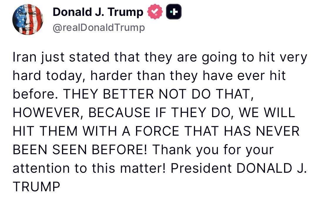 ABD Başkanı Donald Trump, İran’ın ABD’yi daha önce hiç yapmadığı kadar güçlü şekilde vurmakla tehdit ettiğini belirterek, "Bunu yapmasalar iyi olur. Çünkü yaparlarsa onları daha önce hiç görülmemiş bir güçle vururuz" uyarısında bulundu.
