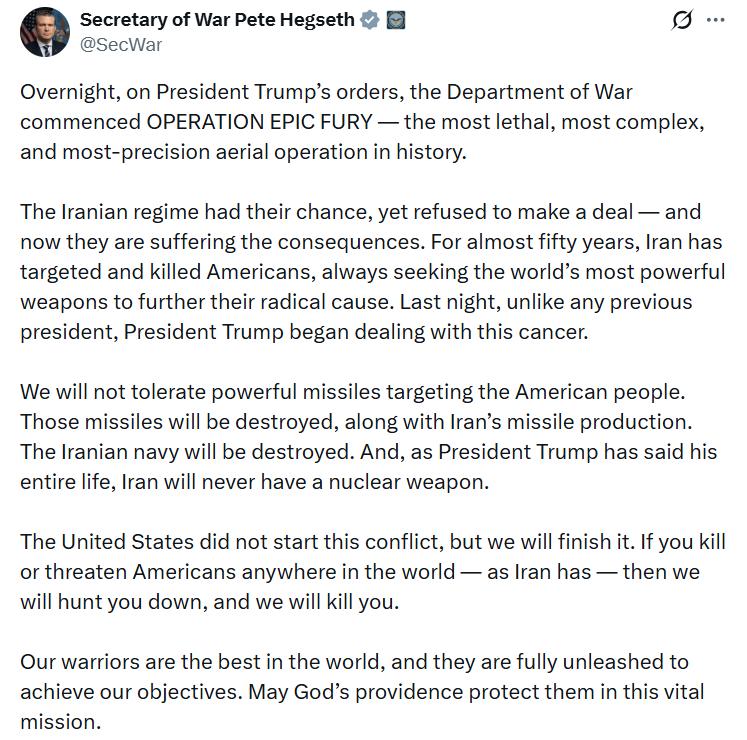 ABD Savunma Bakanı Pete Hegseth, İran'la yaşanan çatışmayı ABD'nin başlatmadığını, ancak ABD'nin bitireceğini belirterek, "Amerikan halkını hedef alan güçlü füzelere müsamaha göstermeyeceğiz. Bu füzeler, İran'ın füze üretim kapasitesi ile birlikte imha edilecek. İran donanması yok edilecek. Başkan Trump'ın tüm hayatı boyunca söylediği gibi, İran asla nükleer silaha sahip olmayacak" açıklamasında bulundu.