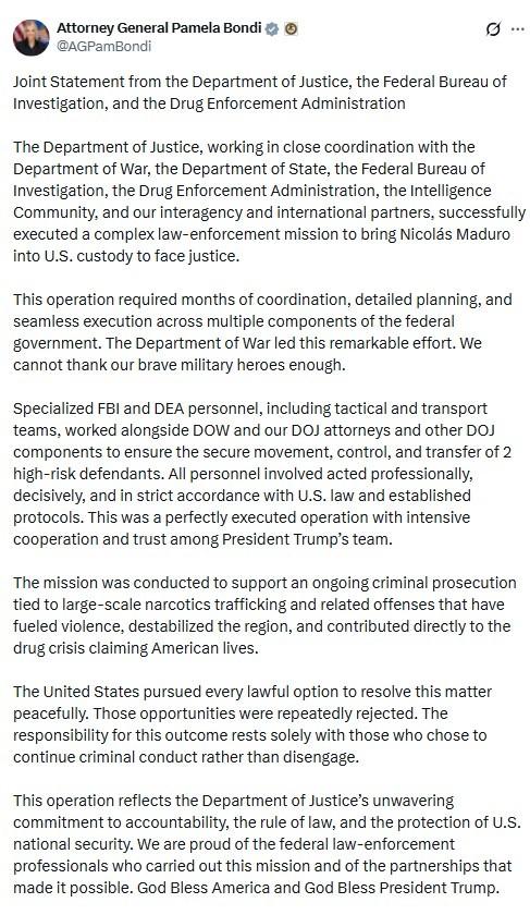 ABD Adalet Bakanlığı (DOJ),Federal Soruşturma Bürosu (FBI) ve Uyuşturucuyla Mücadele Dairesi'nden (DEA) yapılan ortak açıklamada, Venezuela Devlet Başkanı Nicolas Maduro ve eşine yönelik operasyonun uyuşturucu krizi ve bağlantılı suçlarla ilgili yürütülen cezai kovuşturmayı desteklemek amacıyla gerçekleştirildiği savunularak, "ABD bu meseleyi barışçıl bir şekilde çözmek için her türlü hukuki seçeneği değerlendirdi. Bu fırsatlar defalarca reddedildi. Bu sonucun sorumluluğu, suç teşkil eden faaliyetlerini sonlandırmak yerine sürdürmeyi tercih edenlere aittir" ifadelerine yer verildi.