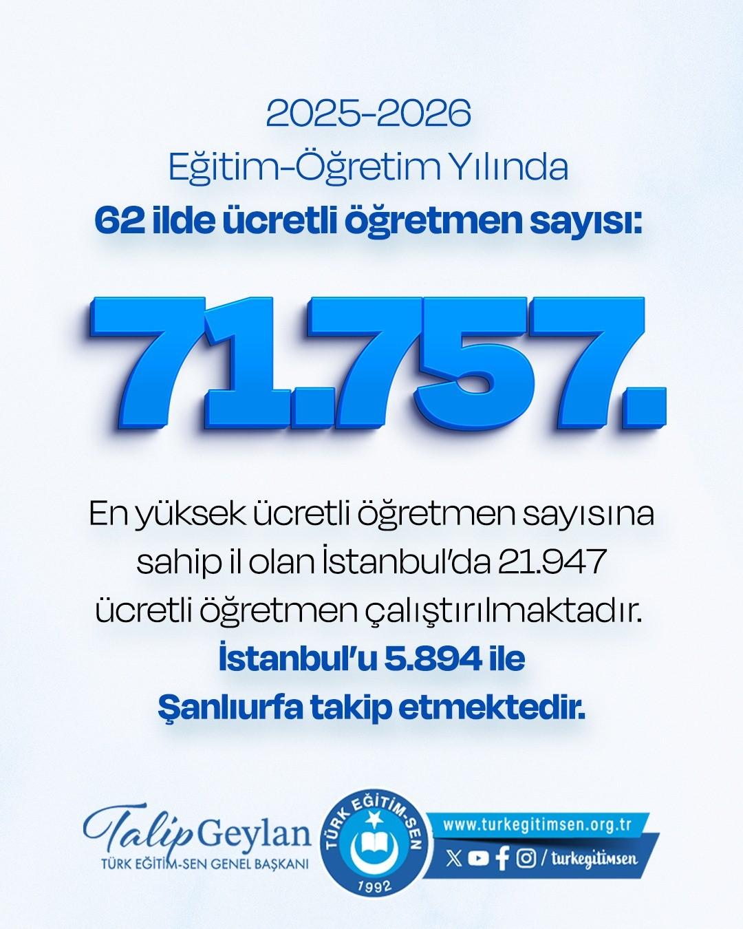Türk Eğitim-Sen, 2025-2026 Eğitim-Öğretim Yılında da Türkiye'de ücretli öğretmen sayılarını araştırdı. Buna göre Konya'nın da dahil olduğu 62 il valiliğinden veri toplayan Türk Eğitim-Sen, 2025-2026 eğitim-öğretim yılında 62 ilde ücretli öğretmen sayısını 71 bin 757 olduğunu açıkladı.