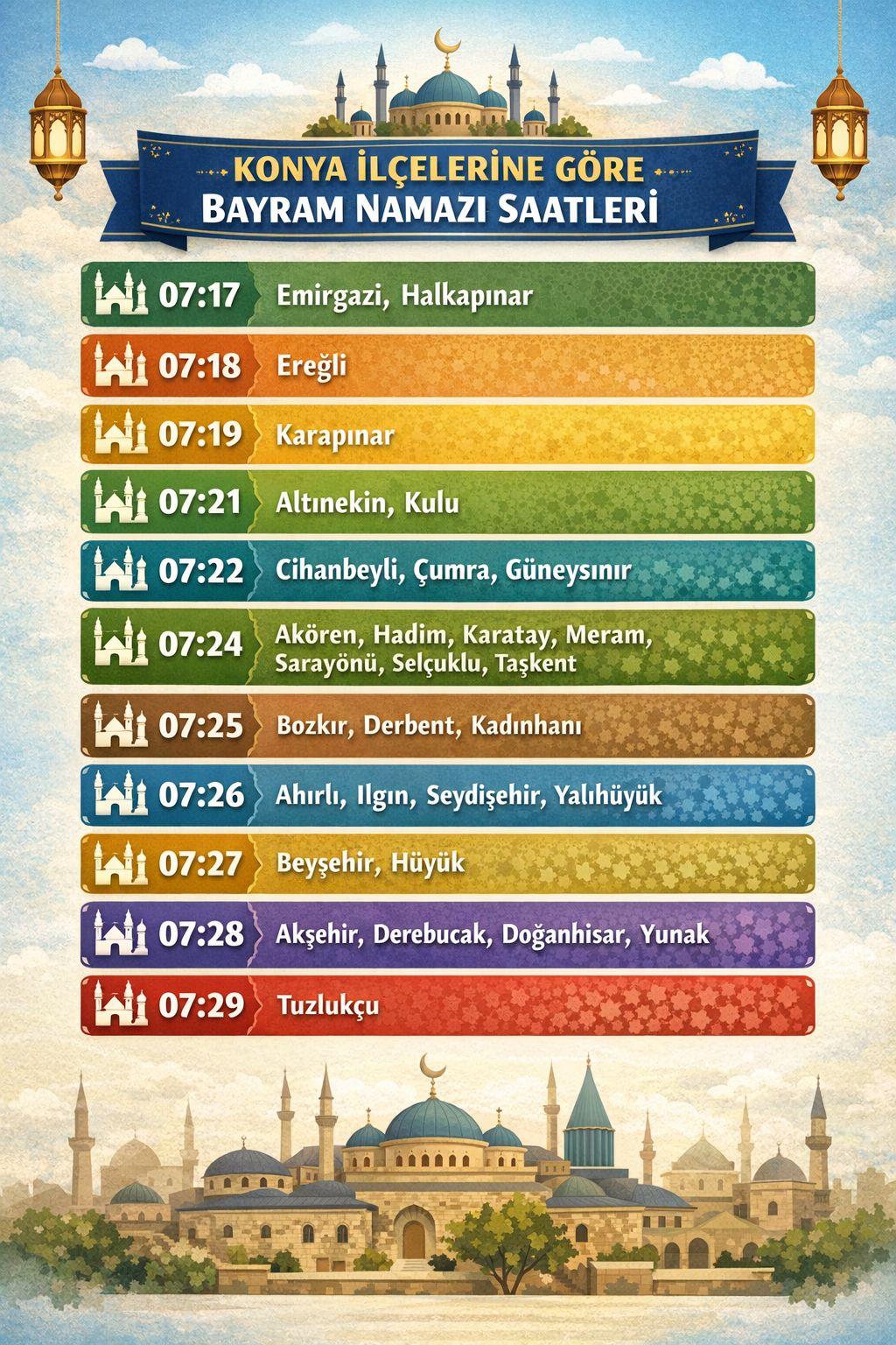 Konya’da ise bayram namazı 07.24’te kılınacak. Diyanet’in yayımladığı takvime göre şehirde namaz saati bu şekilde belirlendi.
