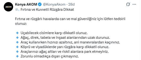 Konya Büyükşehir Belediyesi Afet Koordinasyon Merkezi (AKOM),kent genelinde etkili olması beklenen fırtına ve kuvvetli rüzgâra karşı vatandaşları uyardı. Yapılan açıklamada, olumsuz hava koşullarının günlük yaşamı olumsuz etkileyebileceği belirtilerek gerekli önlemlerin alınması istendi.