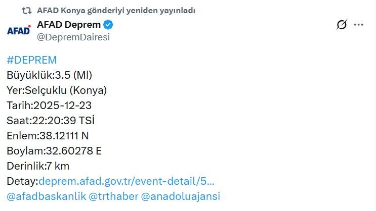 Konya’da akşam saatlerinde hissedilen bir deprem kısa süreli tedirginliğe yol açtı. AFAD ve Kandilli Rasathanesi verilerine göre depremin büyüklüğü 3,5 olarak ölçülürken, sarsıntının merkez üssünün Selçuklu ilçesi olduğu bildirildi.