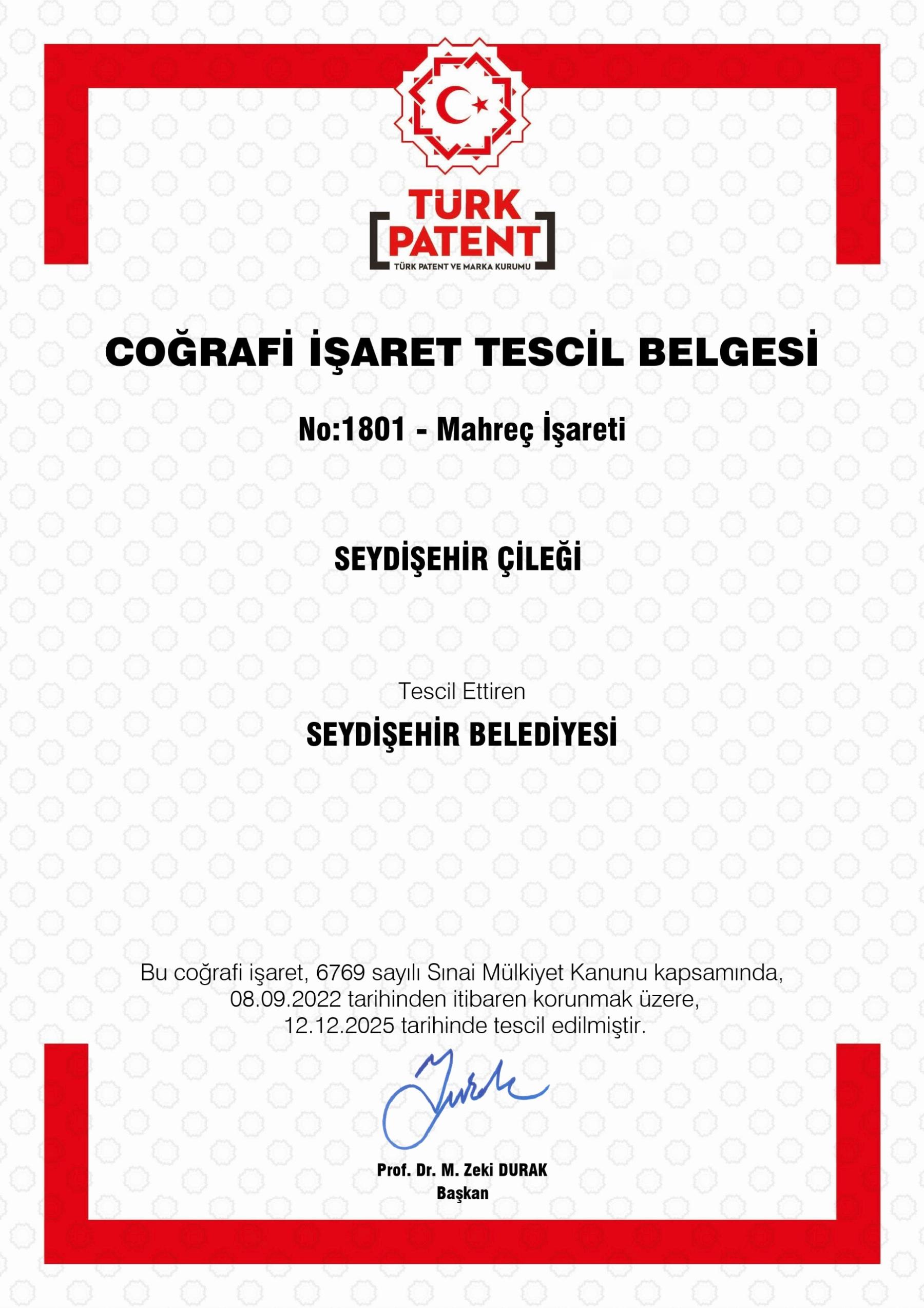 Seydişehir Belediyesinin girişimleri, hazırlamış olduğu teknik çalışma ve analizler neticesinde Türk Patent ve Marka Kurumu tarafından Coğrafi İşaret alarak tescillendi.