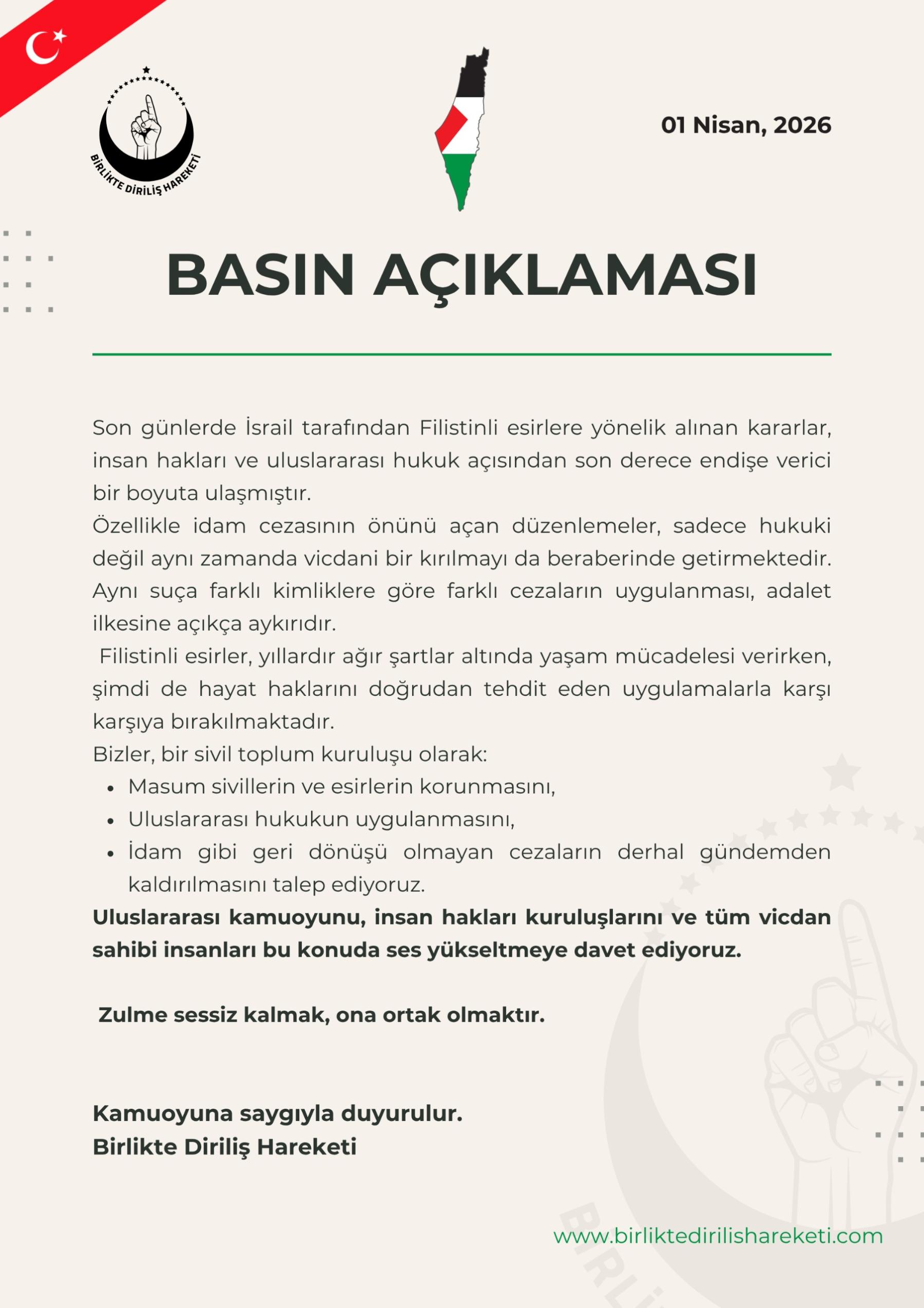 Birlikte Diriliş Hareketi, son günlerde İsrail tarafından Filistinli esirlere yönelik alınan kararlara tepki amaçlı bir bildiri yayınladı. Yapılan basın açıklamasında son günlerde İsrail tarafından Filistinli esirlere yönelik alınan kararların, insan hakları ve uluslararası hukuk açısından endişi verici boyuta ulaşıldığını belirtildi.