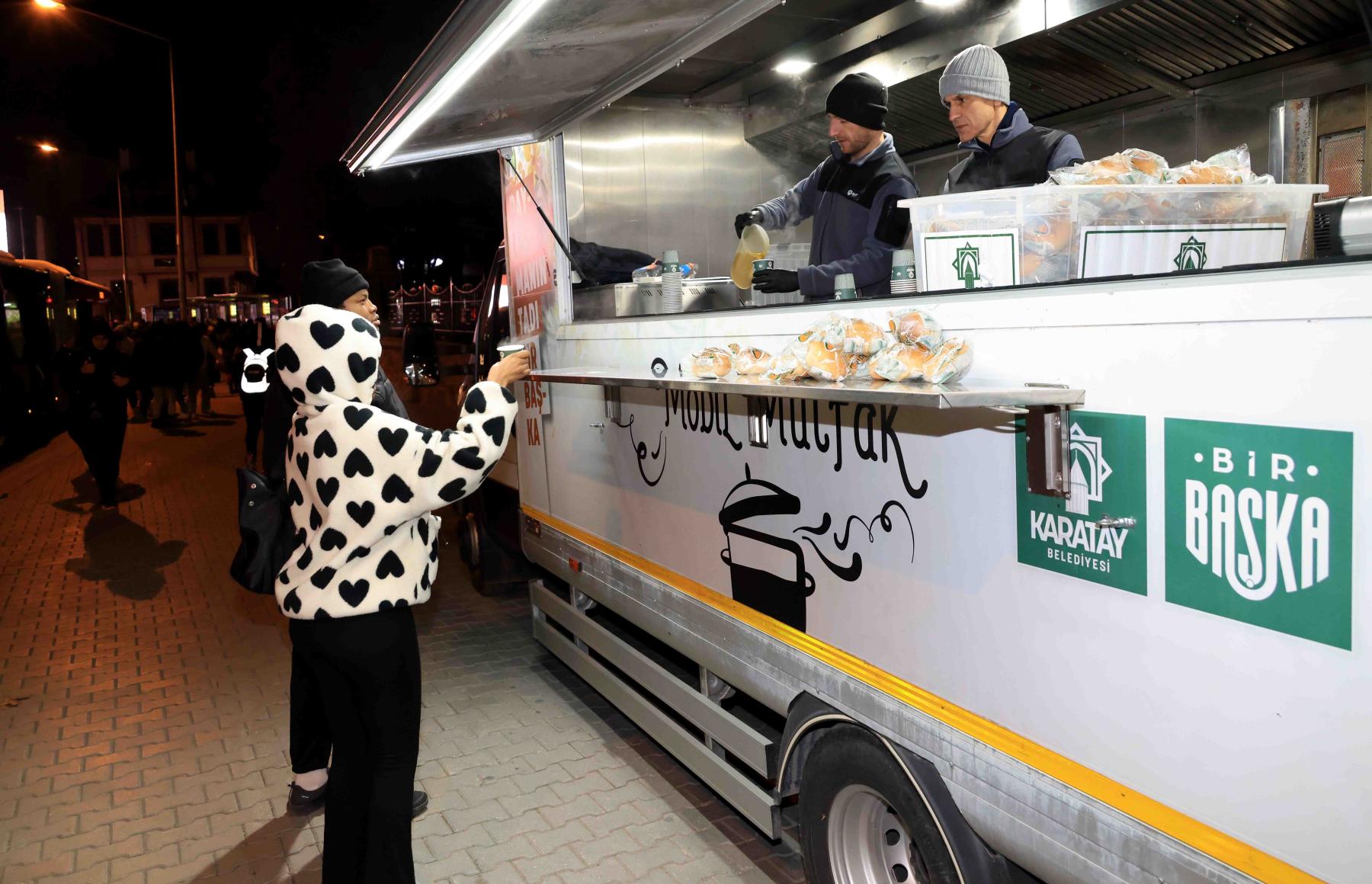 Karatay’da soğuk havalarda ilçenin farklı noktalarında hizmet veren mobil ikram araçlarıyla, sabahın erken saatlerinde işe, okula ya da hastaneye gitmek üzere yola çıkan vatandaşlara sıcak çorba ikram ediliyor. İlçenin işlek noktalarında gerçekleştirilen uygulama ile vatandaşlar güne güzel bir başlangıç yapıyor.