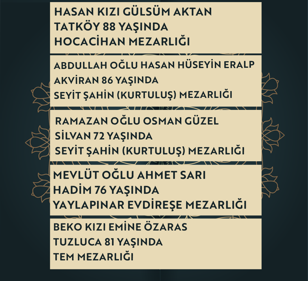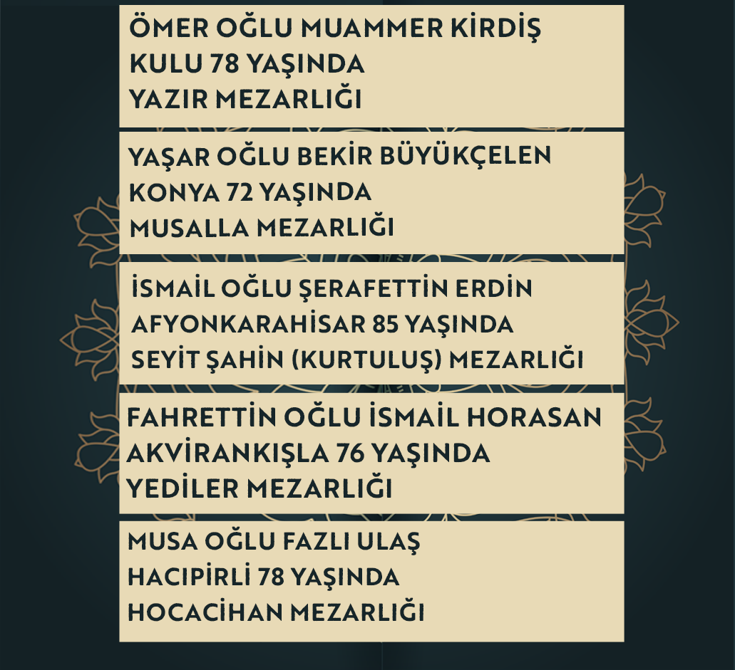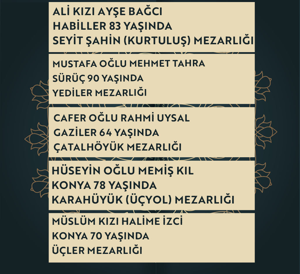 Bugün Konya’da hayatını kaybeden 15 kişi toprağa verildi. İşte 10 Şubat Salı günü vefat edenler ve cenaze bilgileri.