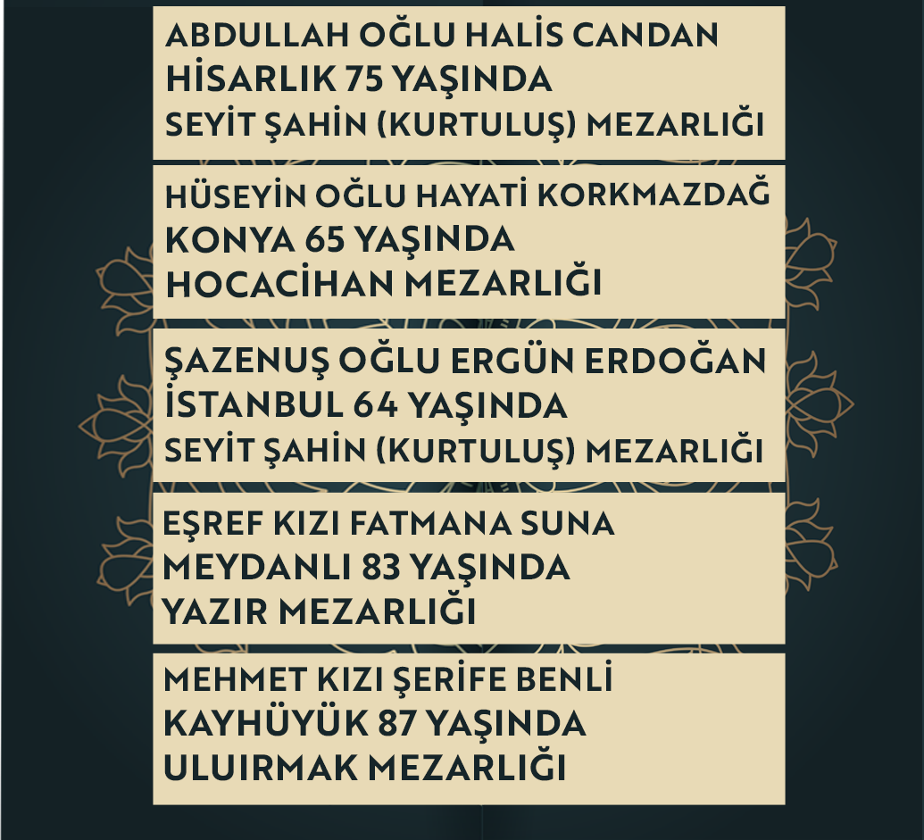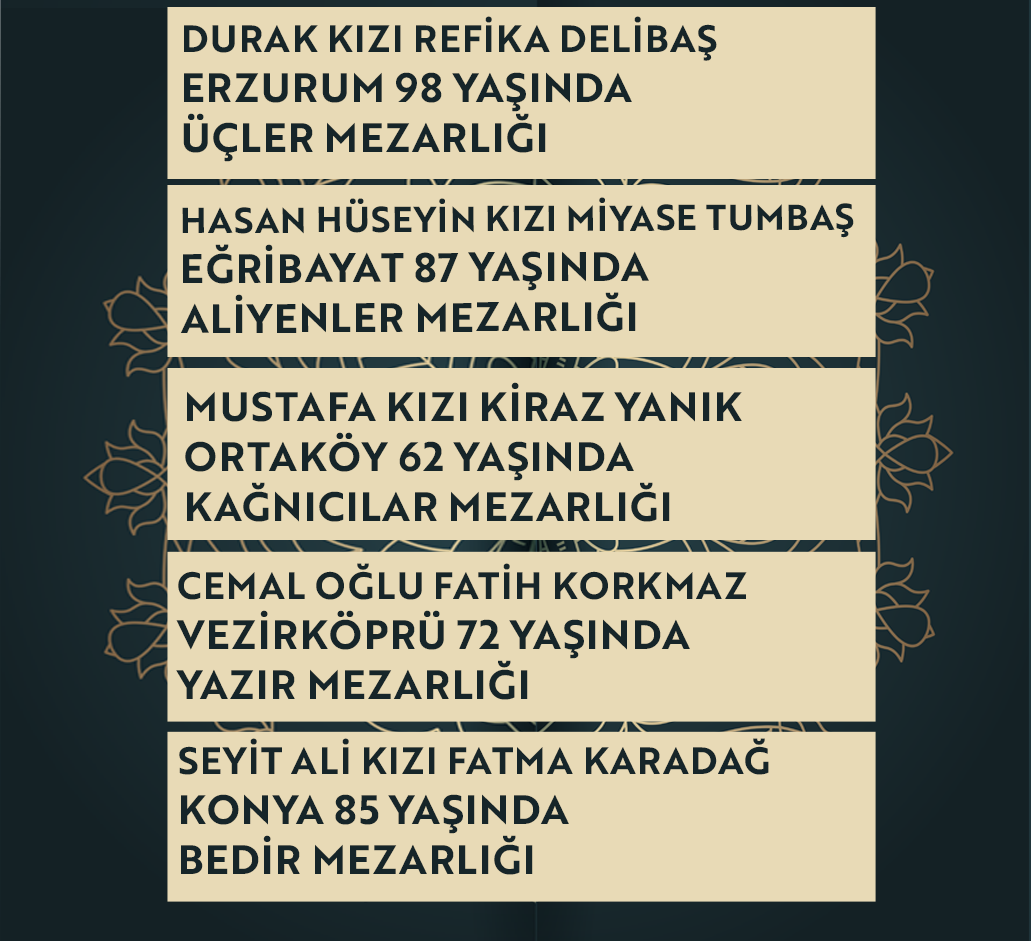 Bugün Konya’da hayatını kaybeden 11 kişi toprağa verildi. İşte 18 Kasım çarşamba günü vefat edenler ve cenaze bilgileri.