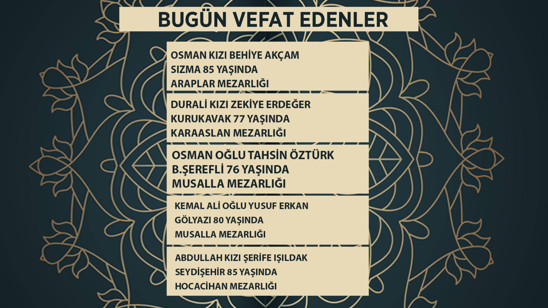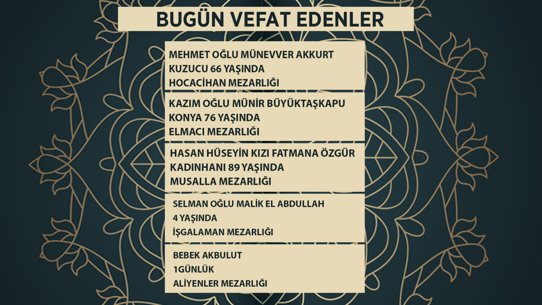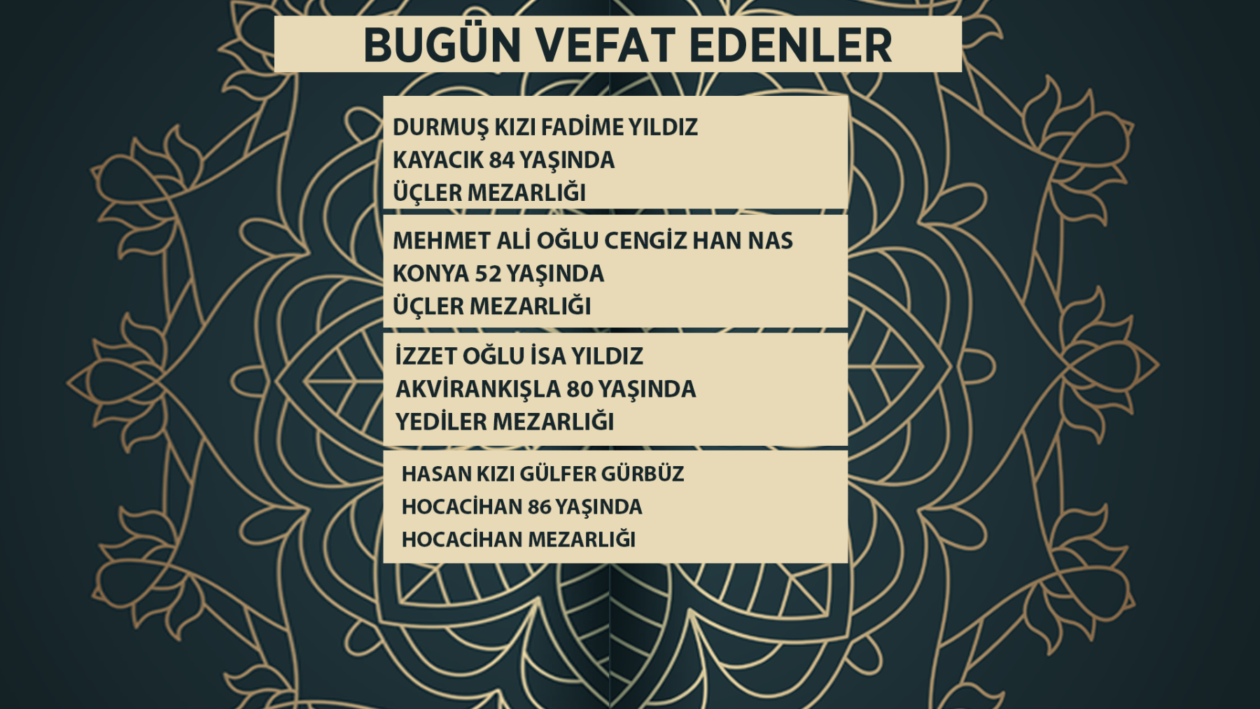 Bugün Konya’da hayatını kaybeden 24 kişi toprağa verildi. İşte 18 Mart Çariamba günü vefat edenler ve cenaze bilgileri.