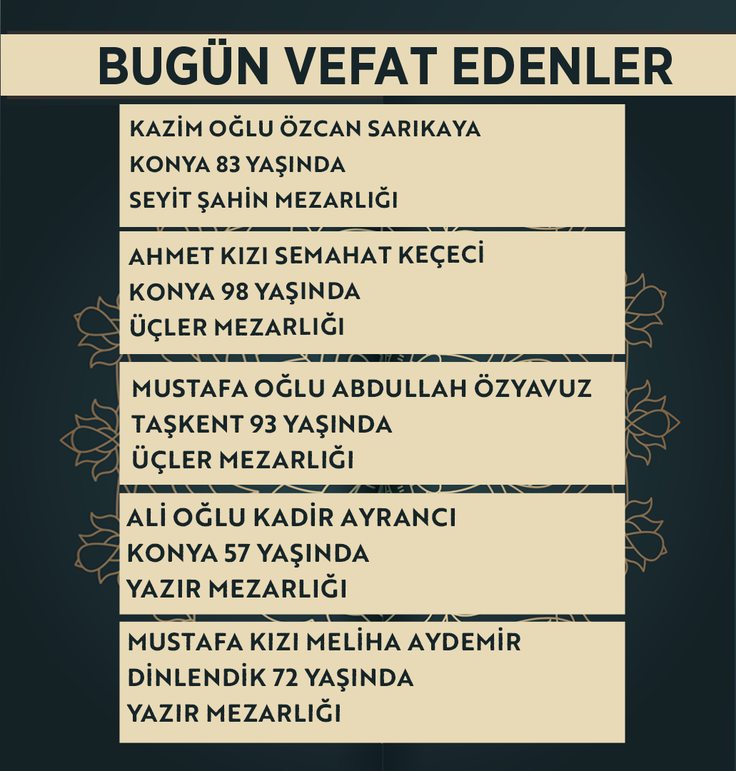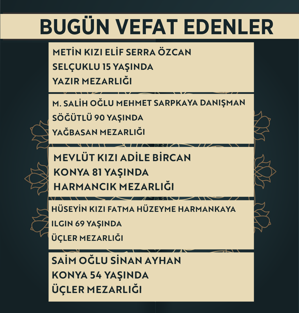 Bugün Konya’da hayatını kaybeden 23 kişi toprağa verildi. İşte 2 Nisan Perşembe günü vefat edenler ve cenaze bilgileri.