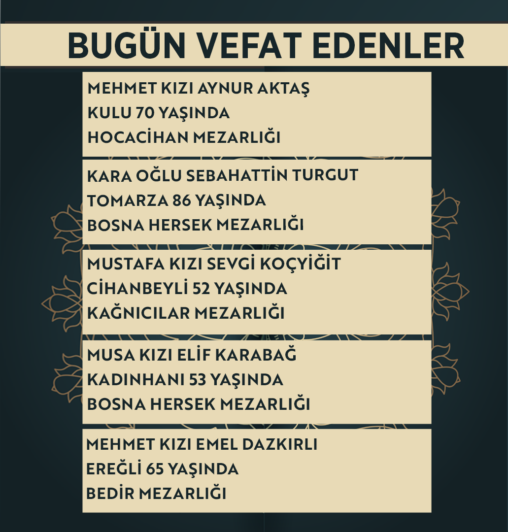 Bugün Konya’da hayatını kaybeden 11 kişi toprağa verildi. İşte 21 Nisan Salı günü vefat edenler ve cenaze bilgileri.