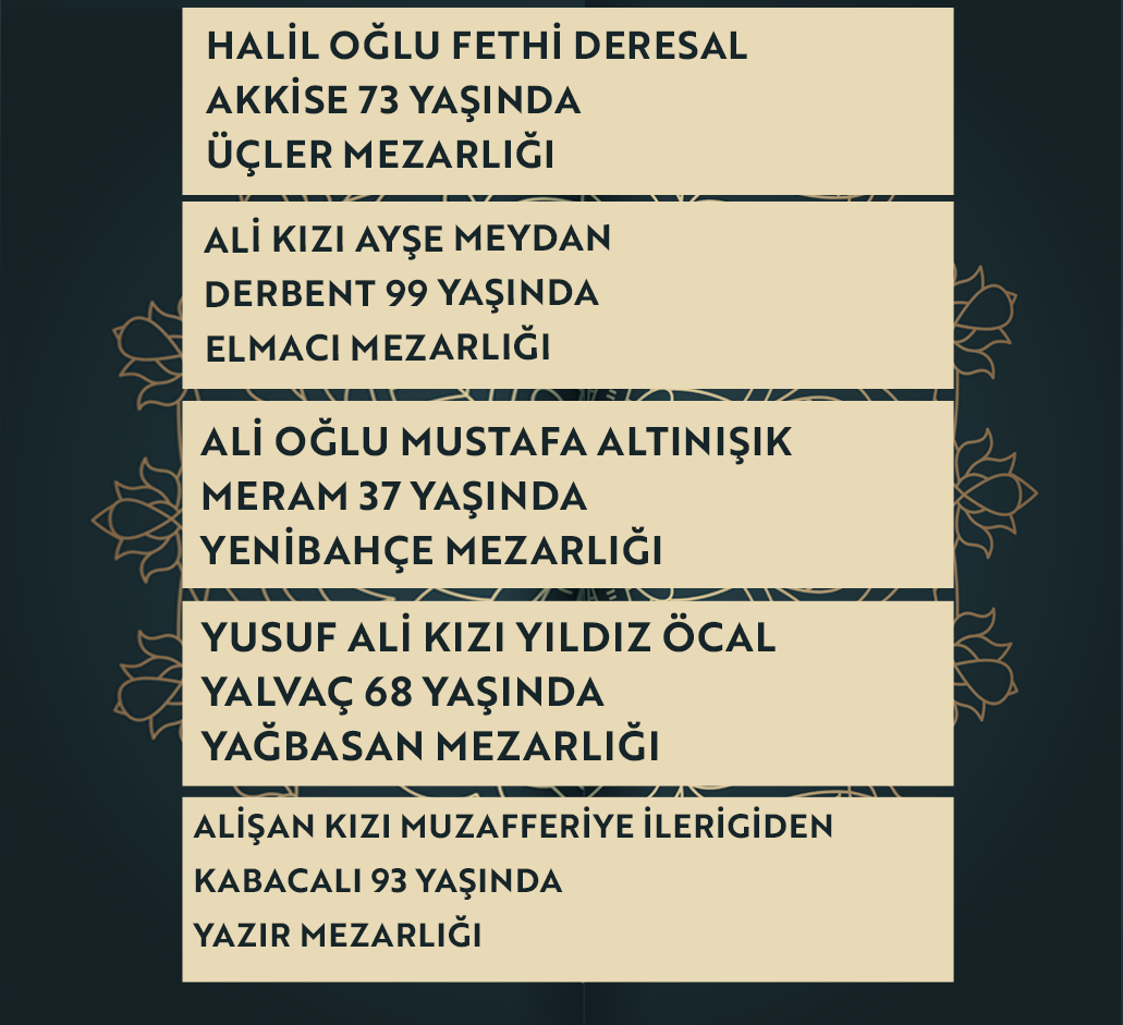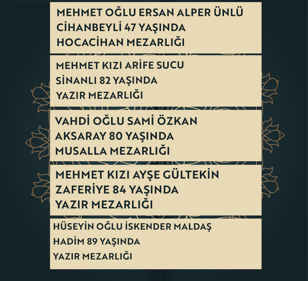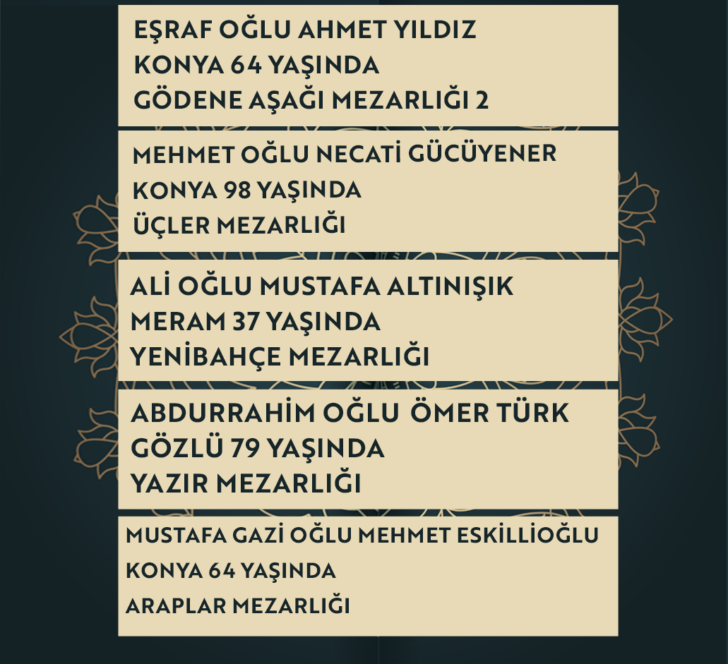 Bugün Konya’da hayatını kaybeden 17 kişi toprağa verildi. İşte 22 Ocak Perşembe günü vefat edenler ve cenaze bilgileri.