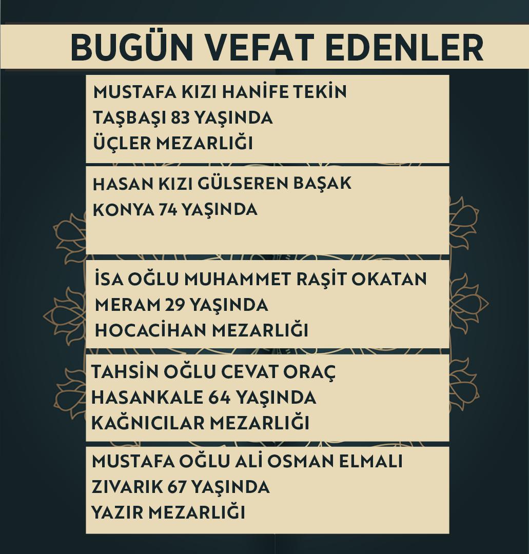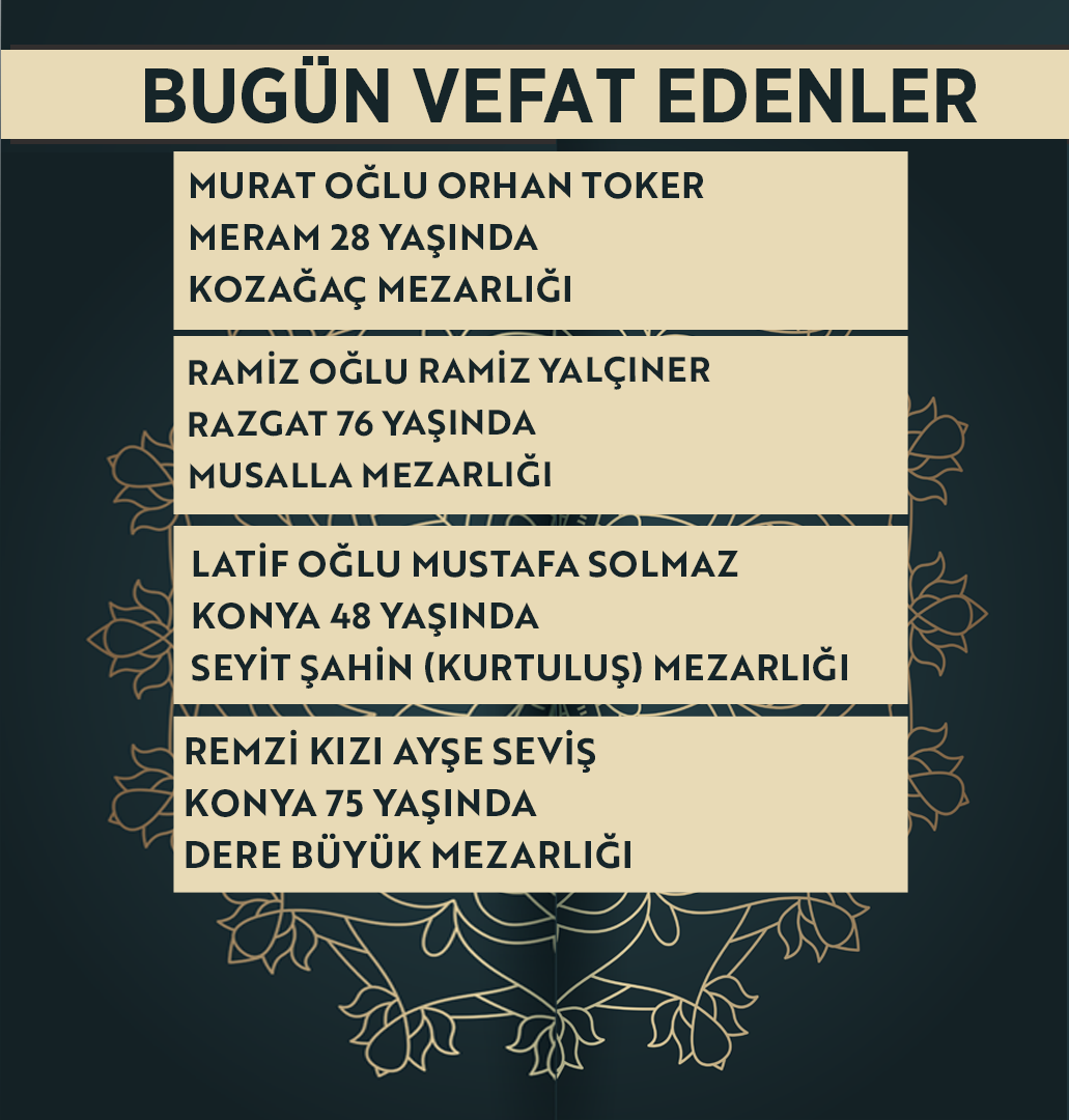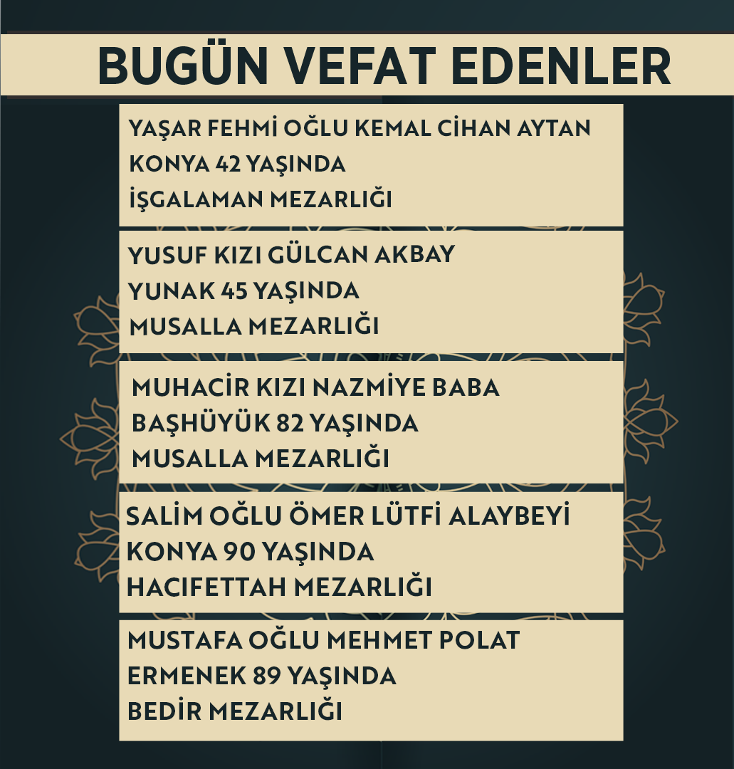 Bugün Konya’da hayatını kaybeden 14 kişi toprağa verildi. İşte 24 Nisan Cuma günü vefat edenler ve cenaze bilgileri.