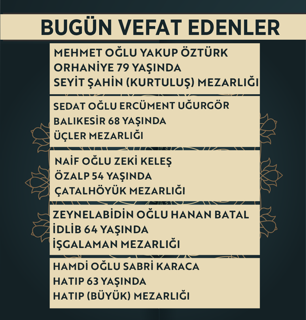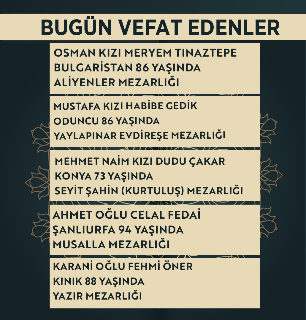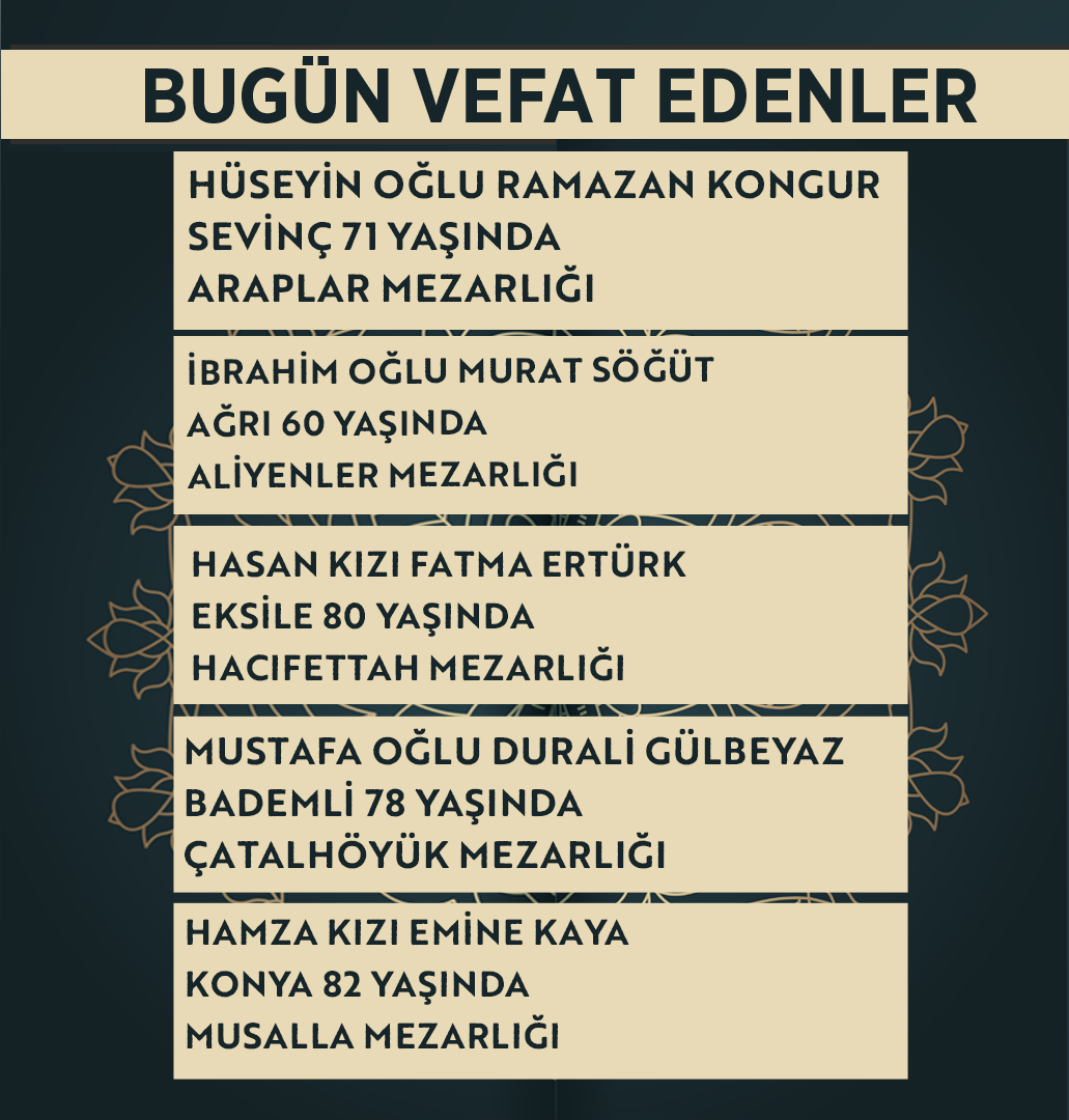 Bugün Konya’da hayatını kaybeden 15 kişi toprağa verildi. İşte 25 Mart Çarşamba günü vefat edenler ve cenaze bilgileri.