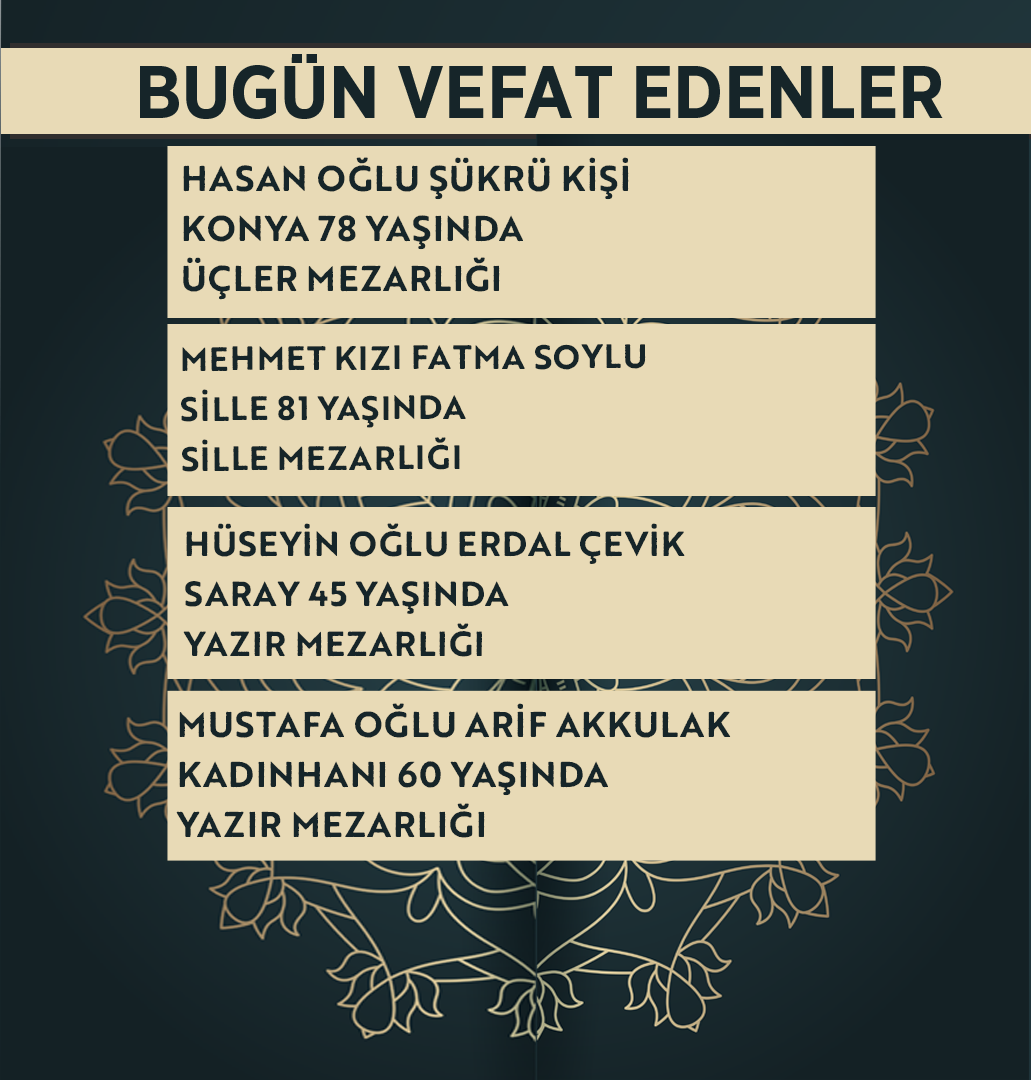 Bugün Konya’da hayatını kaybeden 14 kişi toprağa verildi. İşte 26 Mart Perşembe günü vefat edenler ve cenaze bilgileri.