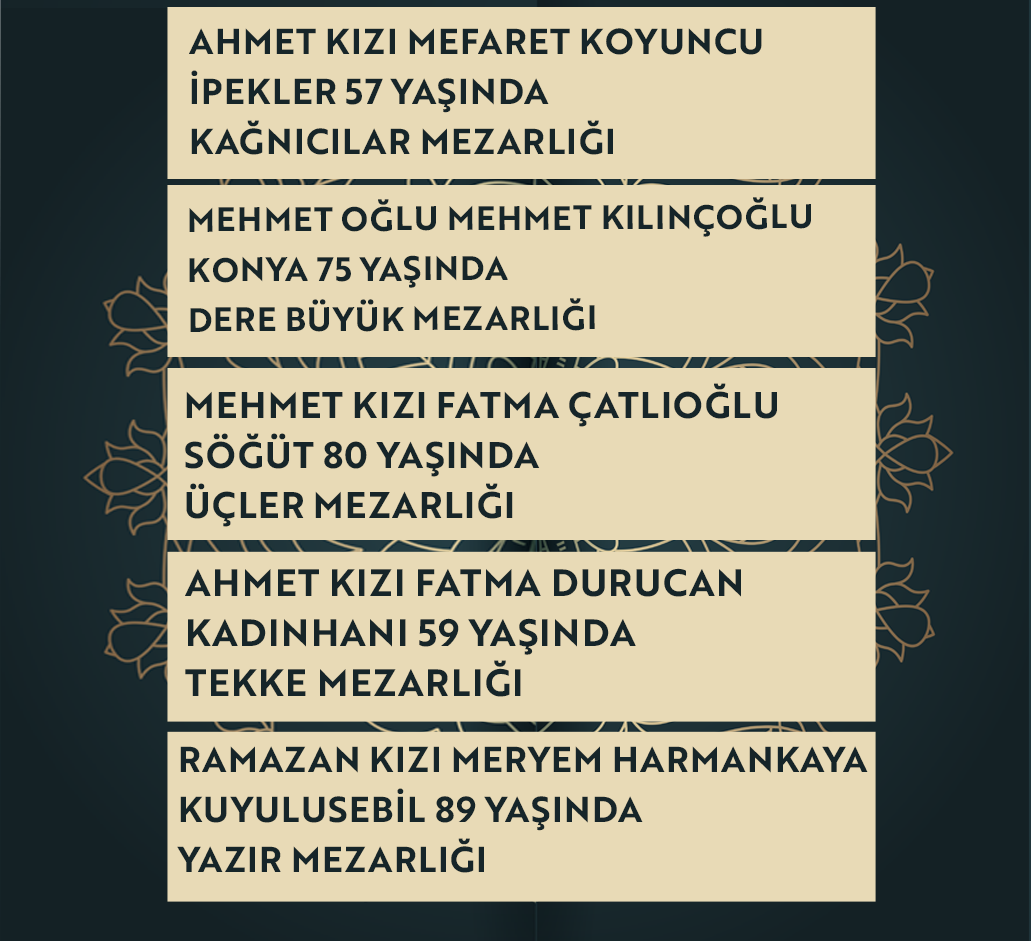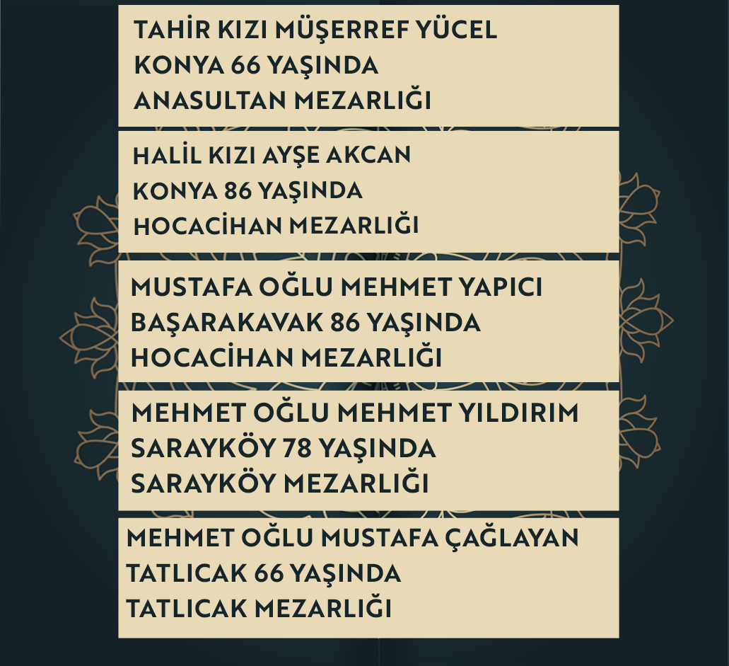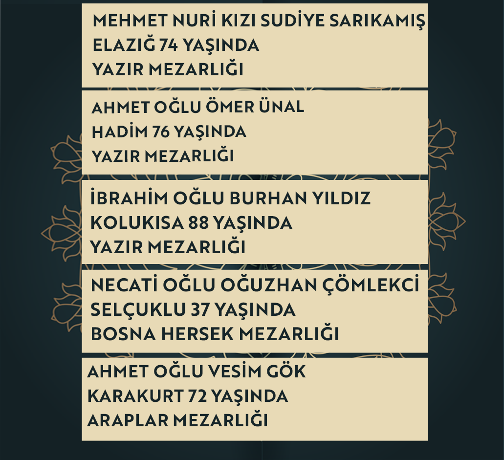 Bugün Konya’da hayatını kaybeden 24 kişi toprağa verildi. İşte 3 Şubat Salı günü vefat edenler ve cenaze bilgileri.