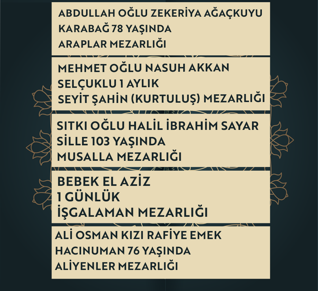 Bugün Konya’da hayatını kaybeden 8 kişi toprağa verildi. İşte 31 Ocak Cumartesi günü vefat edenler ve cenaze bilgileri.