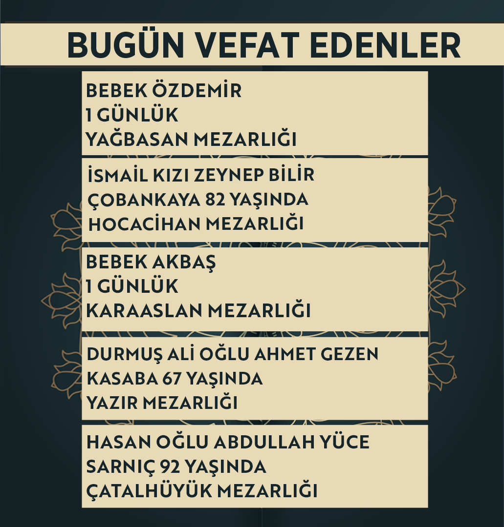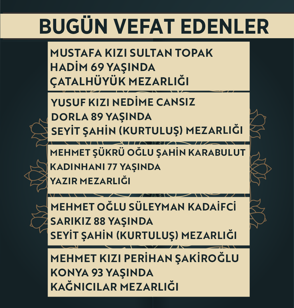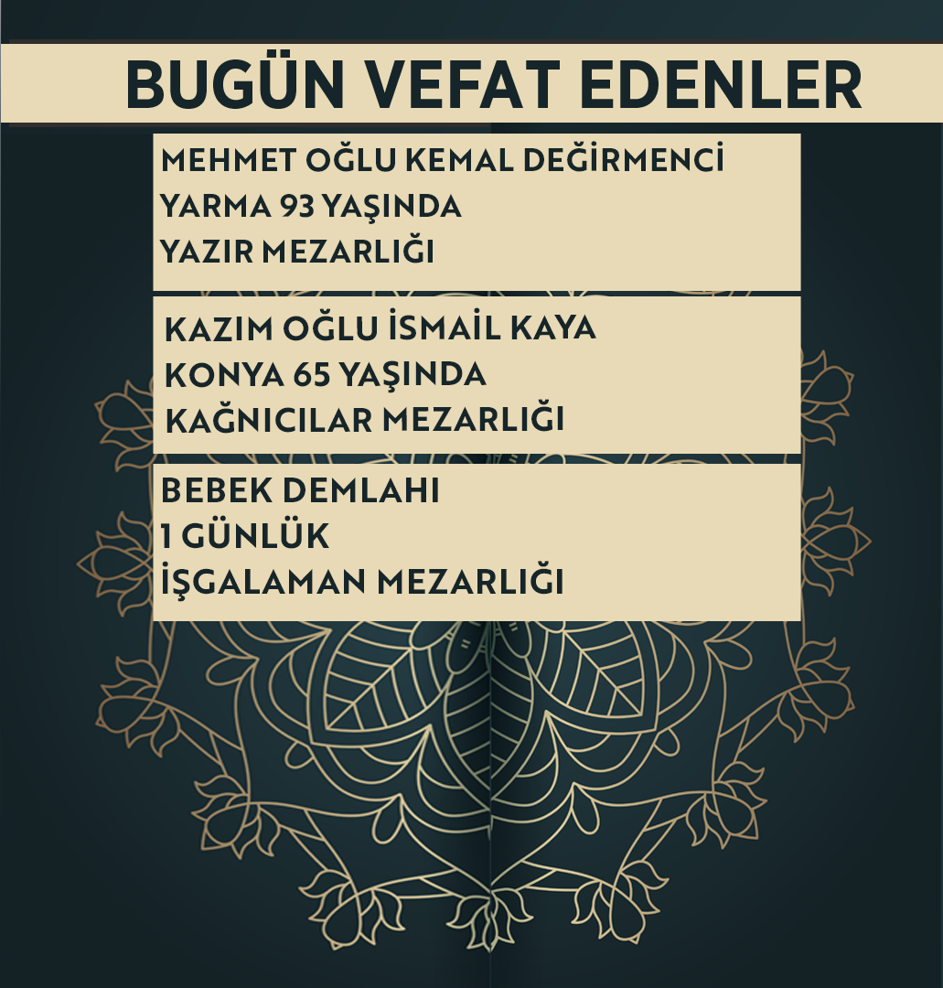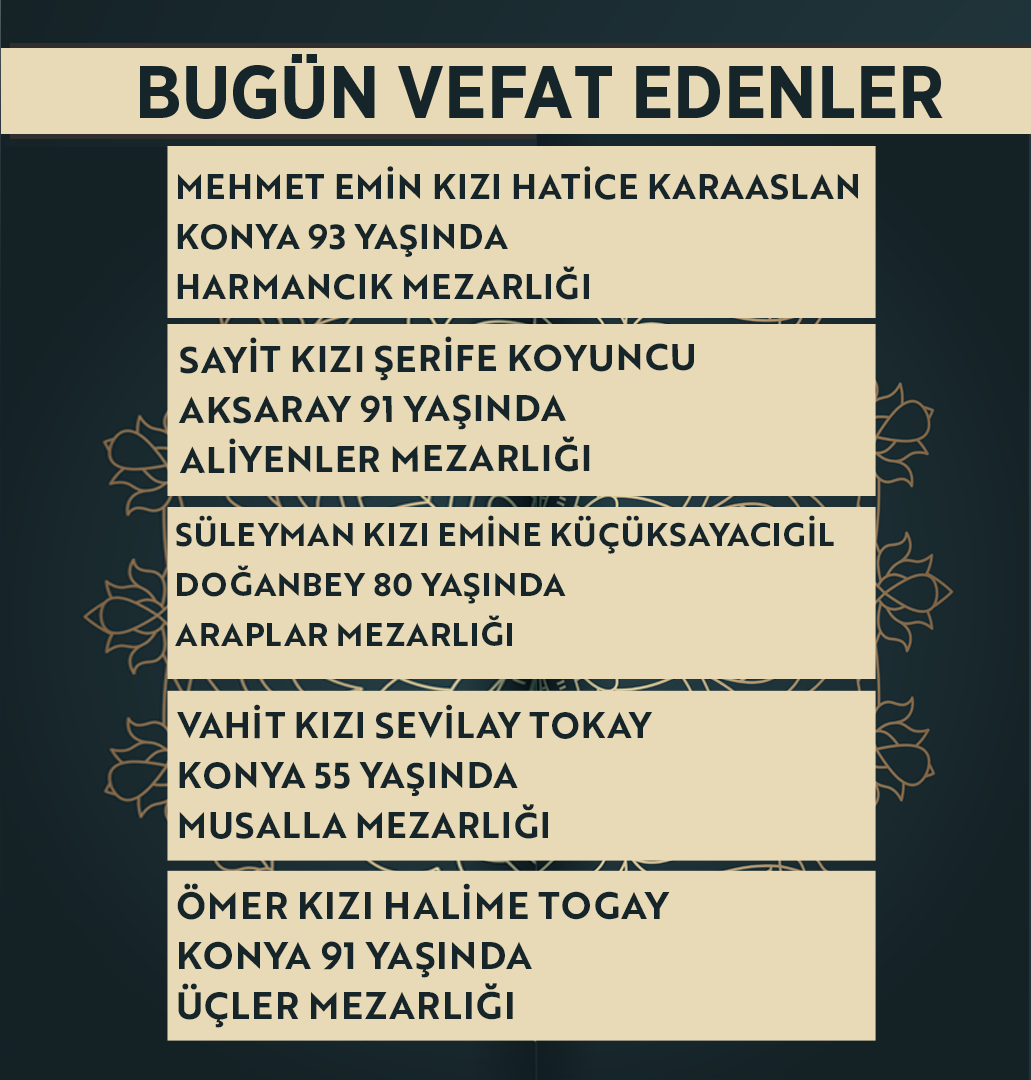Bugün Konya’da hayatını kaybeden 18 kişi toprağa verildi. İşte 7 Nisan Salı günü vefat edenler ve cenaze bilgileri.