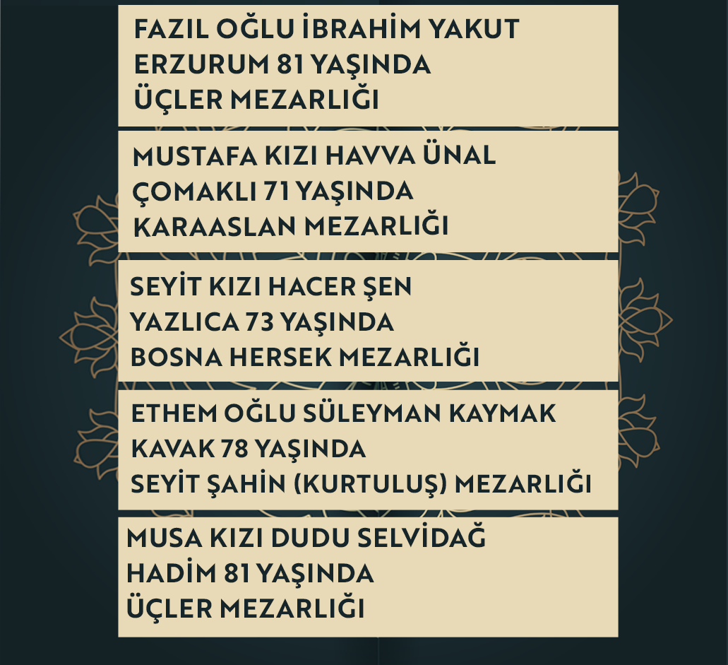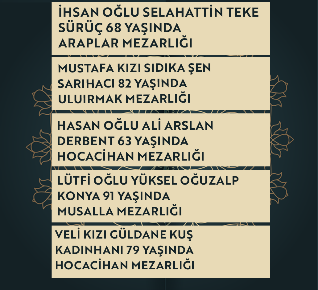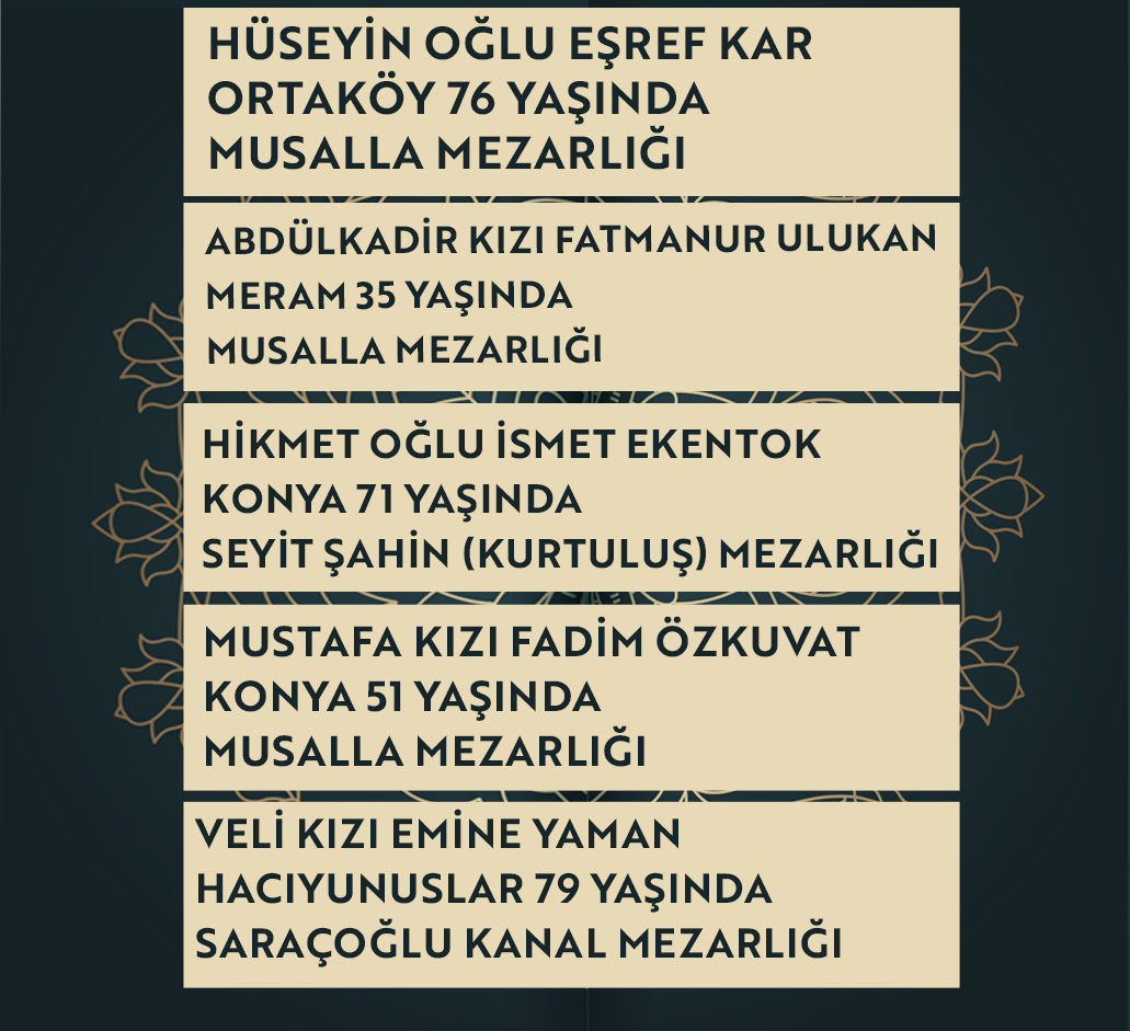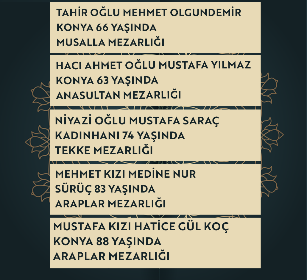 Bugün Konya’da hayatını kaybeden 20 kişi toprağa verildi. İşte 9 Şubat Pazartesi günü vefat edenler ve cenaze bilgileri.