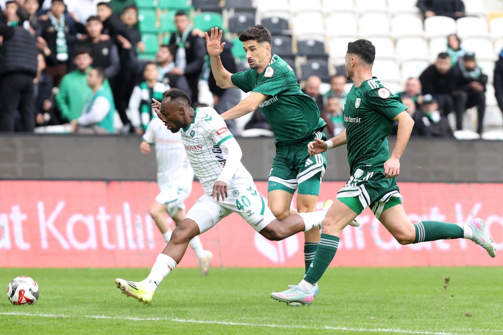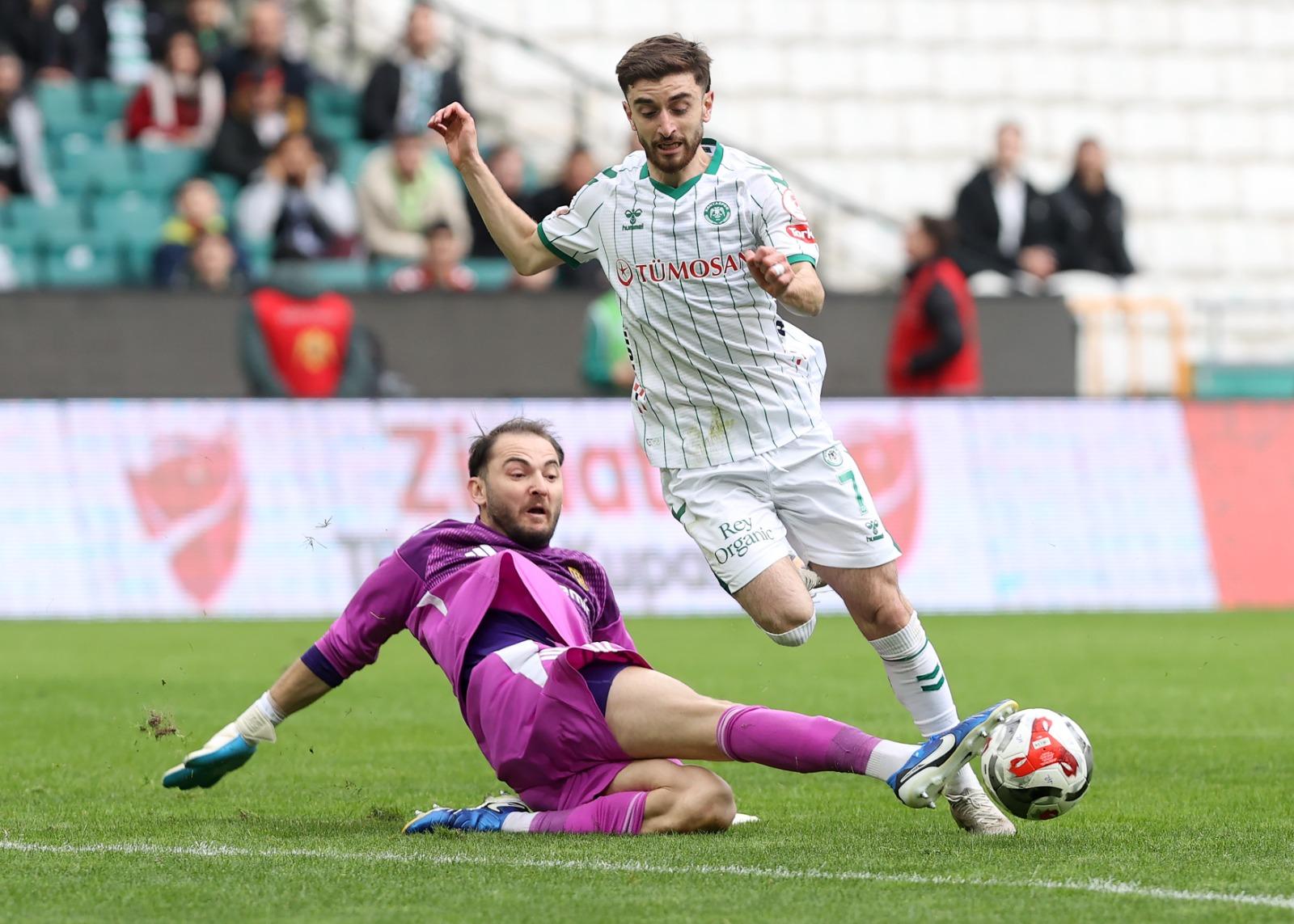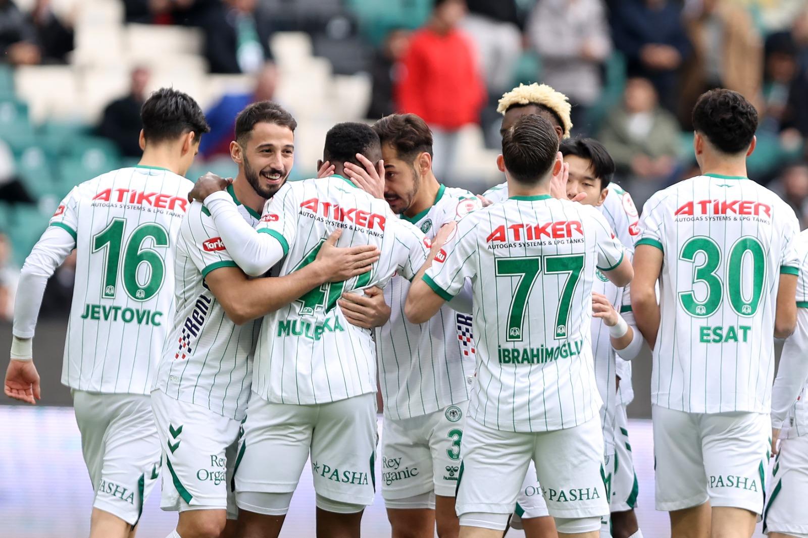 Mücadeleye hızlı başlayan Anadolu Kartalı, henüz 4’üncü dakikada Muleka’nın golüyle 1-0 öne geçti. Bu golün hemen ardından oyundaki üstünlüğünü artıran Konyaspor, 6’ncı dakikada Tunahan Taşçı’nın golüyle farkı ikiye çıkardı. İlk dakikalarda rakibine oyun şansı tanımayan yeşil-beyazlı ekip, 44’üncü dakikada Tunahan Taşçı’nın şutunda Muleka’ya çarpan topun ağlara gitmesiyle skoru 3-0’a taşıdı ve ilk yarıyı farklı üstünlükle tamamladı.