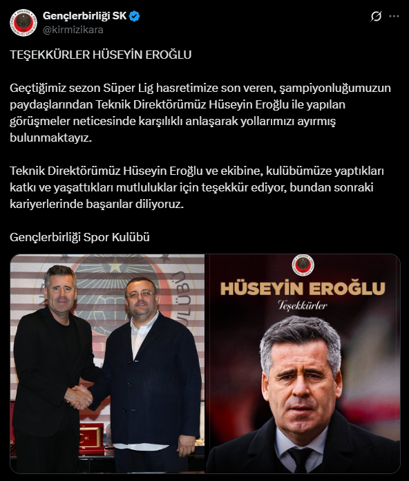 Gençlerbirliği resmi hesaptan yapılan açıklamada, "TEŞEKKÜRLER HÜSEYİN EROĞLU Geçtiğimiz sezon Süper Lig hasretimize son veren, şampiyonluğumuzun paydaşlarından Teknik Direktörümüz Hüseyin Eroğlu ile yapılan görüşmeler neticesinde karşılıklı anlaşarak yollarımızı ayırmış bulunmaktayız. Teknik Direktörümüz Hüseyin Eroğlu ve ekibine, kulübümüze yaptıkları katkı ve yaşattıkları mutluluklar için teşekkür ediyor, bundan sonraki kariyerlerinde başarılar diliyoruz." denildi