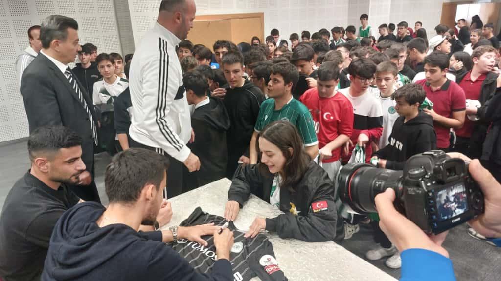 Okul konferans salonunda düzenlenen programı Konyaspor futbolcularından Deniz Ertaş Adil Demirbağ ve Umut Nayir katıldı öğrencilerin yoğun ilgisi ile karşılaşan futbolcular kariyer yolculuklarını yaşadıkları önemli anları ve gençlere yönelik tavsiyelerini paylaştı