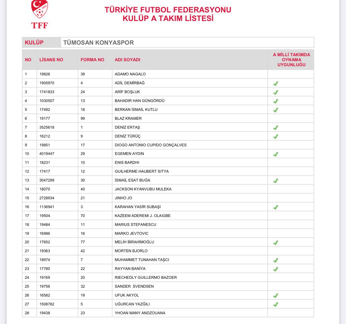 Öte yandan yabancı oyuncu kontenjanı nedeniyle Josip Calusic ve Pedrinho A takım listesinde yer almadı. İki futbolcu, 2025-2026 sezonunun ikinci devresinde forma giyemeyecek.
