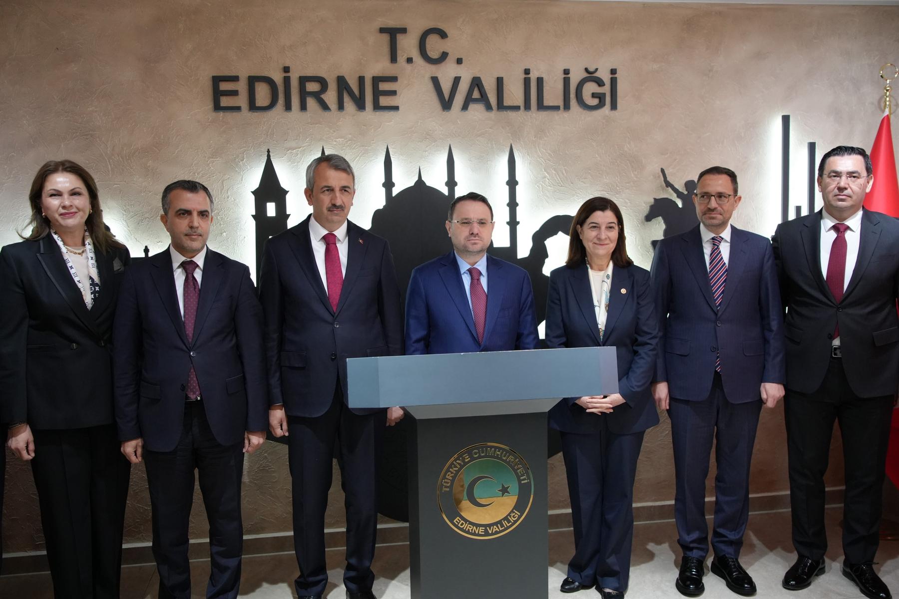 Adalet Bakanı Akın Gürlek yaptığı açıklamada, "Aziz Edirneli hemşehrilerim, Cumhurbaşkanımızın selamlarını sizlere iletmekten ötürü onur duyuyor, sizleri saygıyla selamlıyorum. İmparatorluklara başkent olmuş, Anadolu'dan Avrupa'ya medeniyet ve kültür şehri Edirne'mizde bulunmaktan şeref duyduğumu tekrardan ifade etmek istiyorum. Meriç'in başına taç yapmış yemyeşil ovalarıyla şehre kaftan giydirmiş Mimar Sinan ruhunun şahlandığı Selimiye Camisi'nin kenti Edirne'mize Türkiye Cumhuriyeti'nin Adalet Bakanı olarak bizi misafir ettiniz. Tekraren şükranlarımı ifade etmek istiyorum. Edirne'nin taşıdığı sınır şehir vasfı ile devletimizin kudreti ile hukuk düzeninin en görülü olduğu alanlardan biridir. Sınırda yalnızca güvenlik değil, hukuk da görevdedir. Türkiye'nin Avrupa'ya açılan bir kapısı olan bu şehrimize sunulan adalet hizmeti ülkemizin hukuk devleti kimliğinin dışarıya aynı zamanda bir yansımasıdır. Edirne'nin sınır vilayeti olması sebebiyle yargı sistemimizin de kusursuz bir şekilde işlemesi gerekmektedir. Bu nedenle Edirne'yi ziyaret etmemizdeki maksadımız buradaki yargı işleyişini yakından görmek ve yerinde inceleme yapmaktır. Bu nedenle bugün burada olmaktan ötürü duymuş olduğumuz memnuniyeti ifade etmek istiyorum. Az önce de sayın valim ve kıymetli milletvekilimizle de bir araya geldik. Burada bir müjde olarak verelim. Edirne'de inşallah bölge idare mahkemesi kurulmasına karar verdik. Bu konuda gerekli adımları hem personel genel müdürlüğü hem de hakimler kurulu olarak atacağız. İnşallah Edirne'mize bölge idare mahkemesi yaz kararnamesi ve faaliyeti geçirilecek. Bunu da tekrardan söyleyelim" dedi.