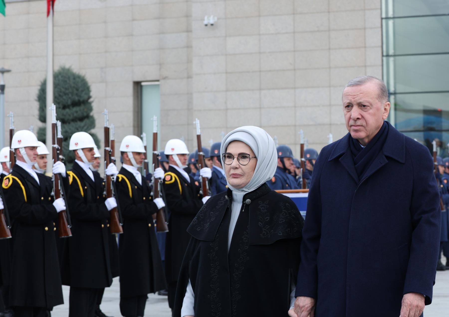 Cumhurbaşkanı Erdoğan, Mirziyoyev’i Cumhurbaşkanlığı Külliyesi'nin ana giriş kapısında karşıladı.