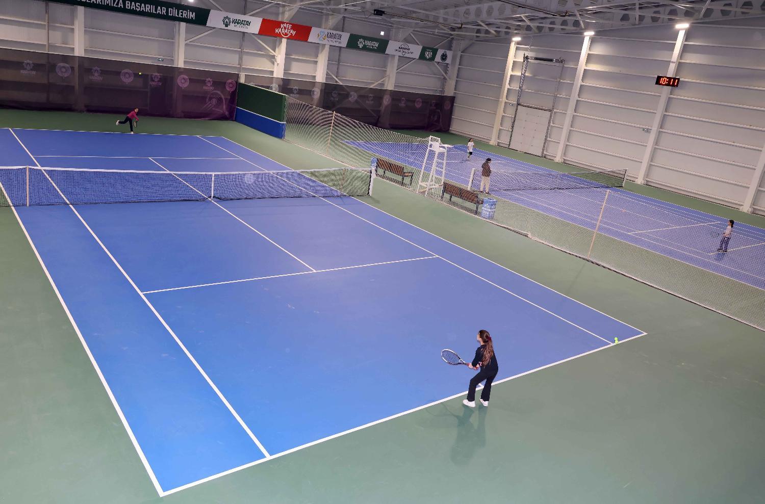 Konya’nın en büyük kapalı tenis kortunda gerçekleştirilen organizasyon, çekişmeli maçlara sahne oluyor.