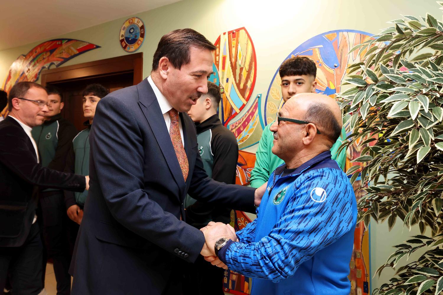 Karatay Belediye Başkanı Hasan Kılca, Konya Şampiyonu olan ve Türkiye Şampiyonası’na katılma hakkı kazanan U16 futbol takımını tebrik etti. Karatay Belediyesi olarak spora ve gençlere önemli destekler verdiklerini vurgulayan Başkan Kılca, “Bizim birinci hedefimiz, çocuklarımızın vatanına, milletine ve bayrağına sahip çıkan iyi birer insan olarak yetişmesidir. Ahlaklı, dürüst ve manevi duyguları güçlü gençlerimiz sıkı çalıştığında başarı kaçınılmaz oluyor. Bu nedenle en büyük pay, gayret gösteren sporcularımızındır. Hocalarımızın da çok büyük emekleri var. Destek, iyi niyet ve çalışma olunca başarı da beraberinde geliyor. Hepinizi tebrik ediyorum.” dedi. Karataylı genç futbolcuların elde ettiği başarılarda okullar arası turnuvaların da büyük etkisi olduğunu belirten Kılca şöyle devam etti; “Yıllardır tüm okullar arasında turnuvalar düzenliyoruz. Bu turnuvalar, başarıların yakalanmasında büyük katkı sağlıyor. Yeteneklerin işlenmesi ve kulüple birlikte yürütülen çalışmalar sayesinde başarılar ortaya çıkıyor. Bu başarının arkasında çalışkanlık, gayret ve sabır yatıyor. Hocalarımızı, kulüp yönetimimizi ve ailelerimizi de tebrik ediyor, Türkiye Şampiyonası’nda başarılar diliyorum.”