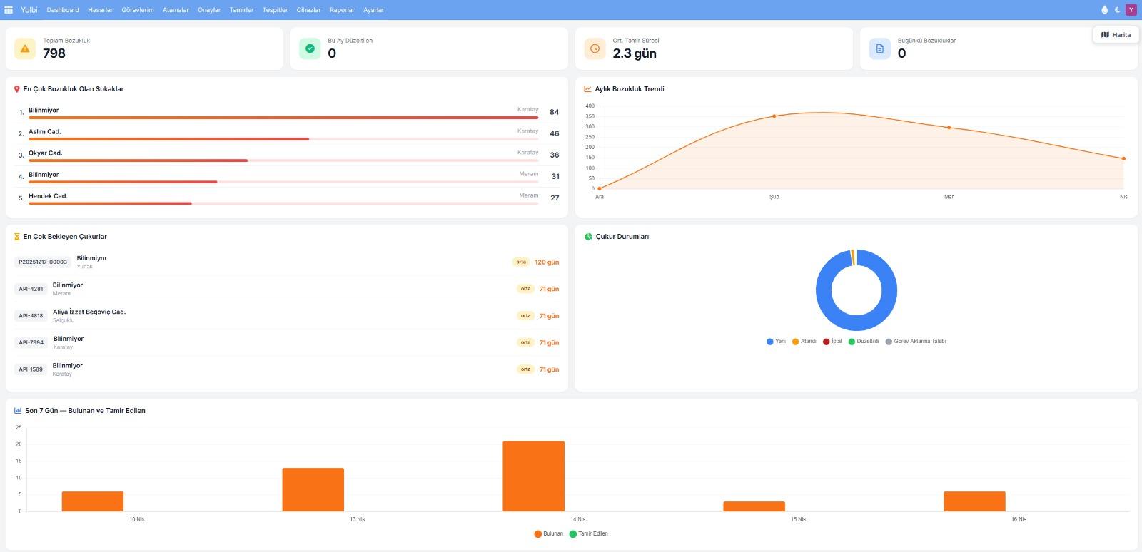 YOLBİ’de geliştirilen merkezi yönetim yazılımı, sahadan gelen tüm verileri tek bir platformda toplayarak kapsamlı bir izleme ve analiz imkânı sunacak. Tespit edilen her bir bozukluk; konumu, zamanı, görüntüsü ve müdahale durumu ile birlikte kayıt altına alınıyor. Bu sayede geçmişe dönük raporlama yapılabilecek, bakım süreçleri ölçülebilir ve sürdürülebilir bir yapıya kavuşarak hizmet standartları yükselecek.