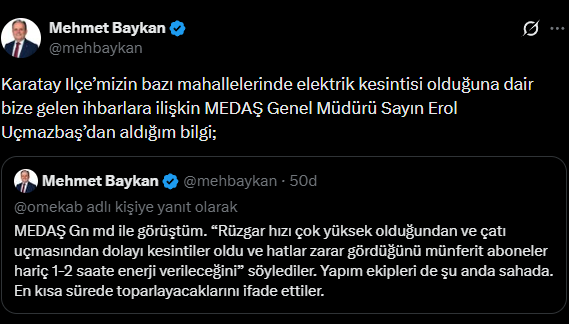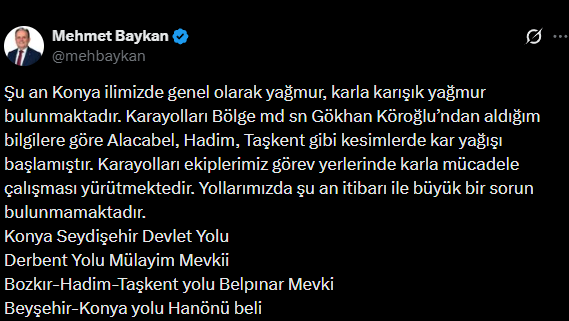 Ak Parti Konya Milletvekili Mehmet Baykan, bugün yaşanan olumsuz hava koşullarına, ulaşım da görülen aksmalara ve elektrik kesintilerine ilişkin X platformu üzerinden yaptığı paylaşımda hem karayolları hem de Meram Elektrik Perakende Satış Anonim Şirketi (MEDAŞ) ekiplerinin çalışmalarına devam ettiğini, büyük çapta bir sorun yaşanmadığını belirti.